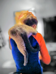 Hercules jumps onto his Mom's shoulders and sometimes lays across her shoulders and falls asleep, Hercules is also toilet trained