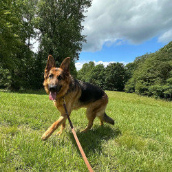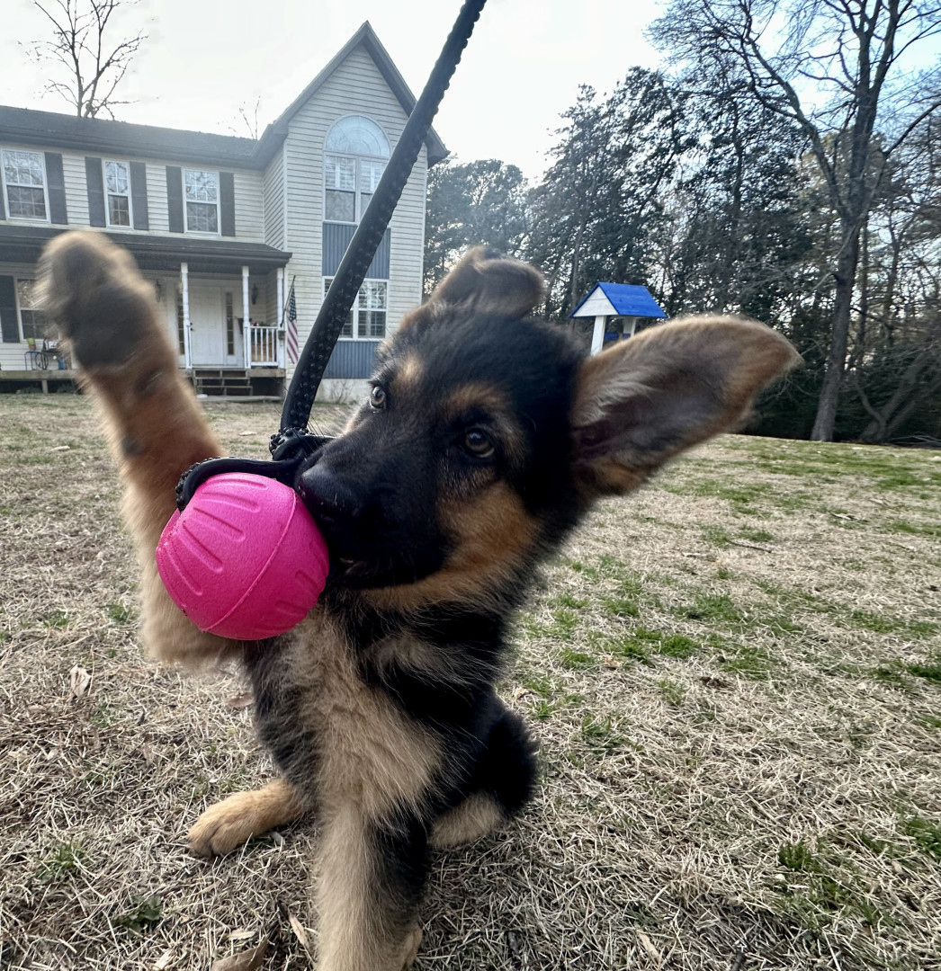 Hondo loves a bright, bouncy rubber ball. It’s slightly larger than a tennis ball, allowing for a satisfying bounce that keeps him engaged during playtime. He enjoys chasing it around the yard, leaping & bounding after it with boundless energy. Whether he’s playing fetch or entertaining himself by bouncing it against the ground, this toy brings him endless joy & keeps him active. It’s durable enough to withstand his enthusiastic chewing, making it the perfect companion for his adventures.