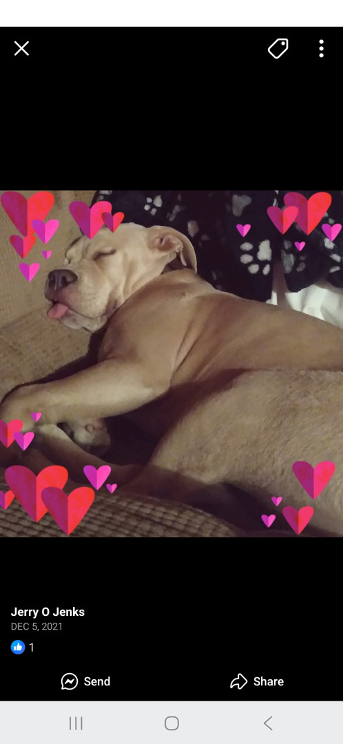Hoover is gentle, loving, and very sponkey. Hes the friendliest dog, acts tough. He stole my bed, and my heart, he's my best friend