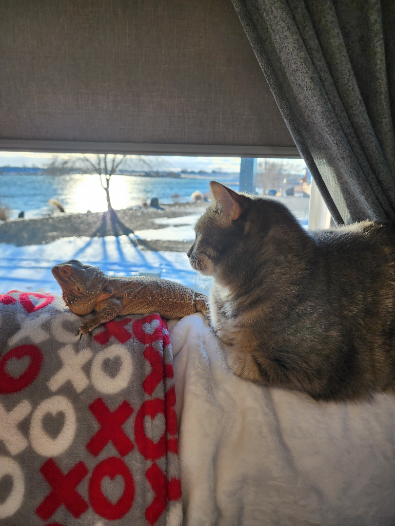 Hunter is 5 years old & very outgoing and very independent cat that acts likes she is a dog half the time, her best friend Ruby a dragon.