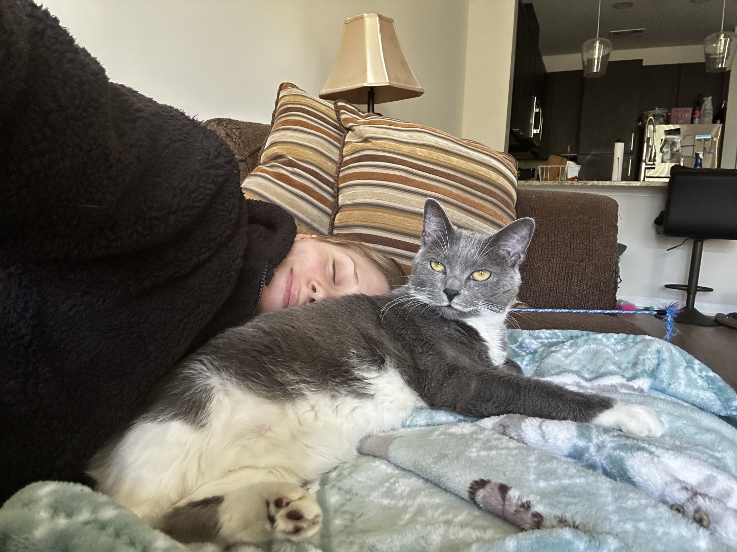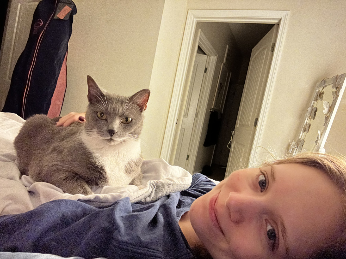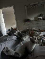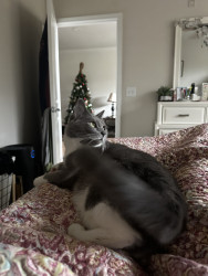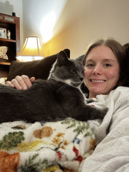 Indy is a very good cat that I never even had to train, which is so surprising for a stray cat that lived outside for over a year! She’s never jumped on counters or gotten into stuff she is not supposed to. She never even wakes me up in the morning for food because she is too busy cuddling with her mom. She lays on my chest every single night as soon as I move the tv tray out of the way after dinner! She even lays on my chest or back while I sleep. We are very dependent on each others company