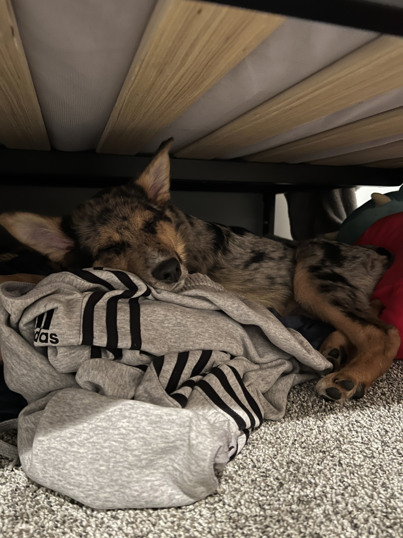 Indy has a HUGE personality, and is full of all the spunk in the world. He loves to learn new tricks, play in the snow, and is guaranteed to make you laugh! He enjoys sleeping under the bed, pushed up against something, and usually on his back with all 4 legs up. He loves car rides, is very curious about everything, is the most relaxed at the cabin, and likes to go on any kind of adventure. He was voted most improved in his puppy kindergarten class, and was very proud of himself!