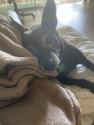 Isabelle is about 8 years old. We rescued her 6 years ago. She is the most laid back dog until someone knocks on the door!!!