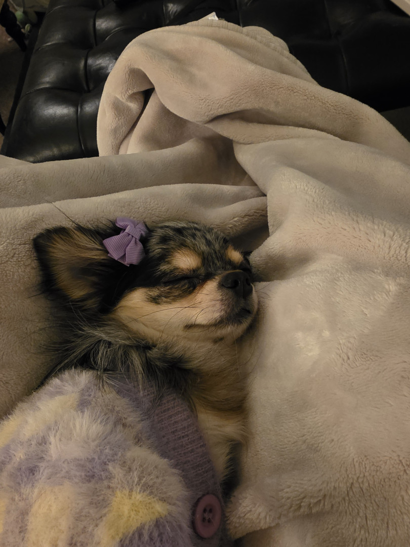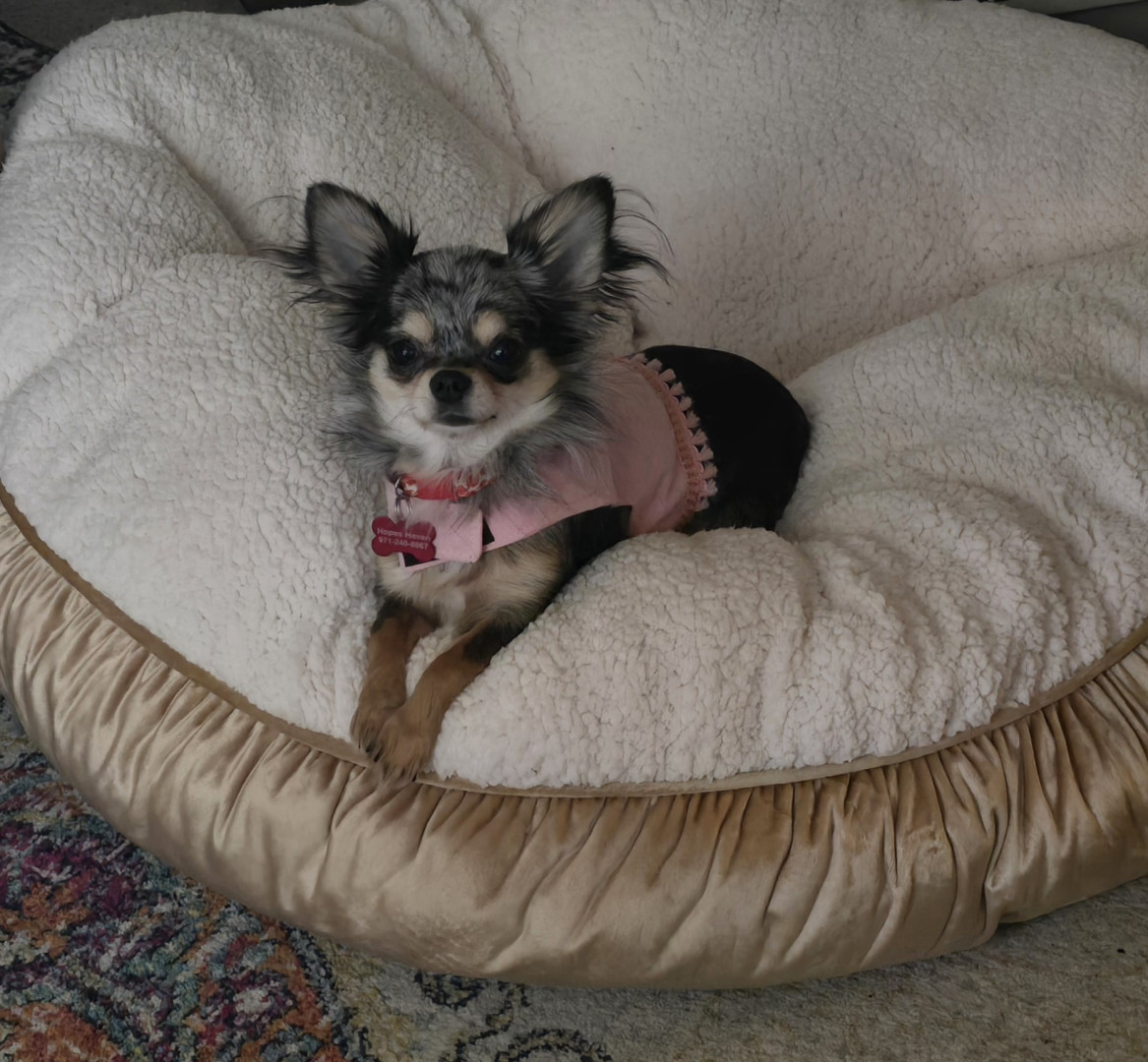 Ivy Rose started life facing more challenges than any puppy should, but she’s grown into a joyful, lively girl full of personality. She showers everyone with affection, steals her brother’s toys just for fun, and races after bottle caps like treasures. With her tiny tongue always showing and her paws politely crossed, Ivy reminds us how love can turn hardship into pure happiness.