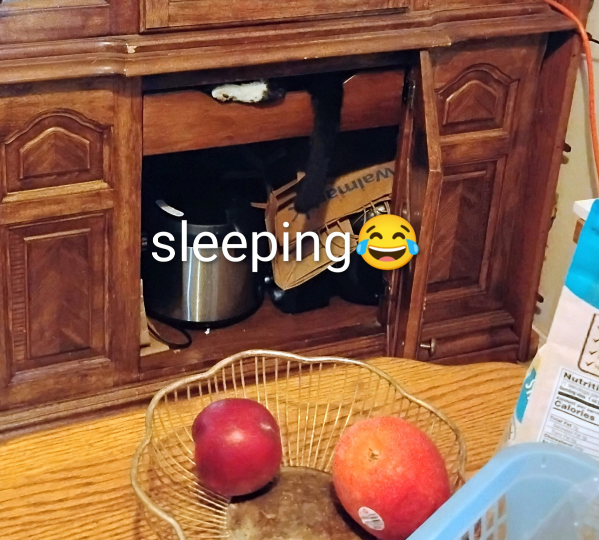 He crawls into the most unsuspectful place to sleep. When I come back from grocery shopping I just throw the bags on the floor because I know Jack will go and make a home in it. He opens the pantry door by himself and shuts it and when I go looking for him that's the first place I check because he's asleep in the soup cans. LOL and that's no joke😁
