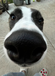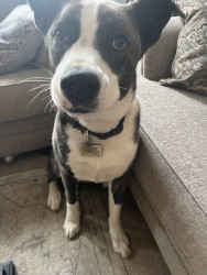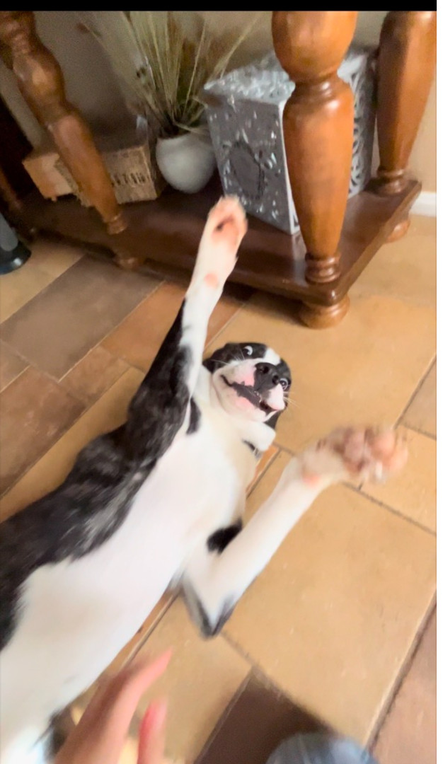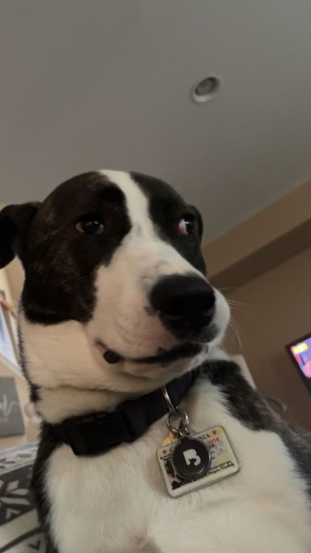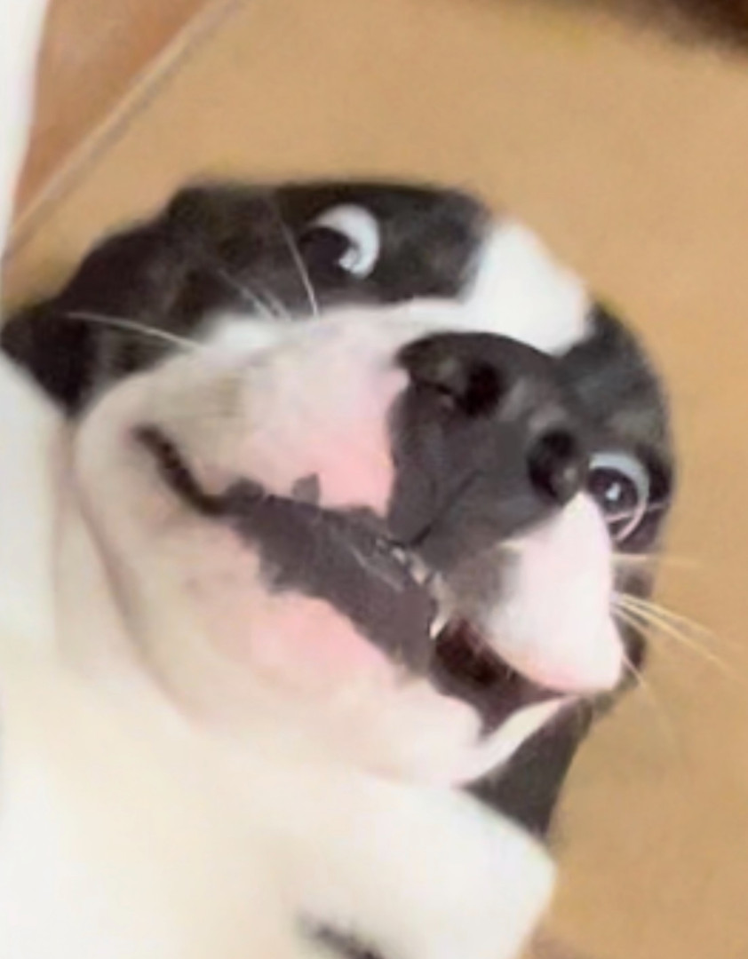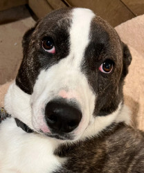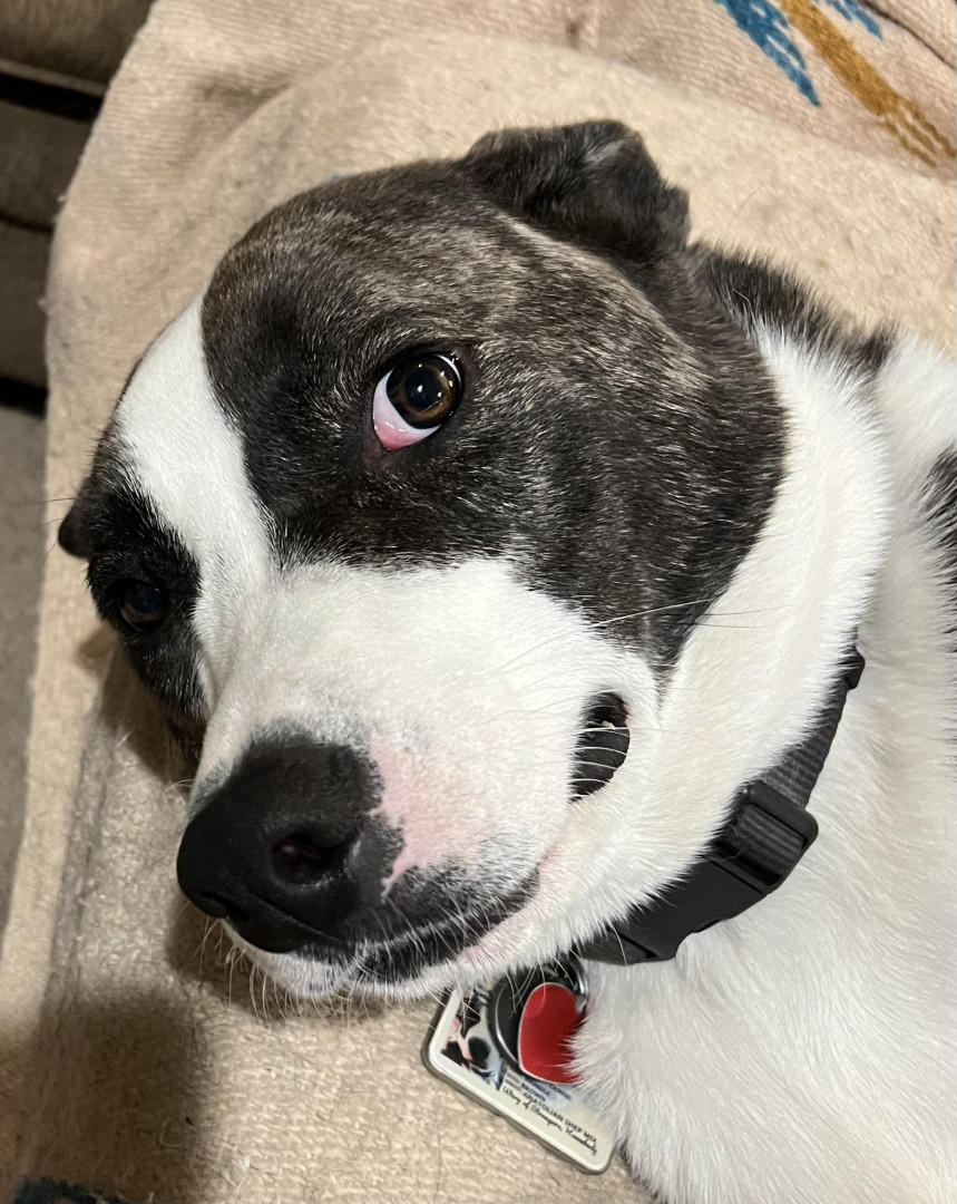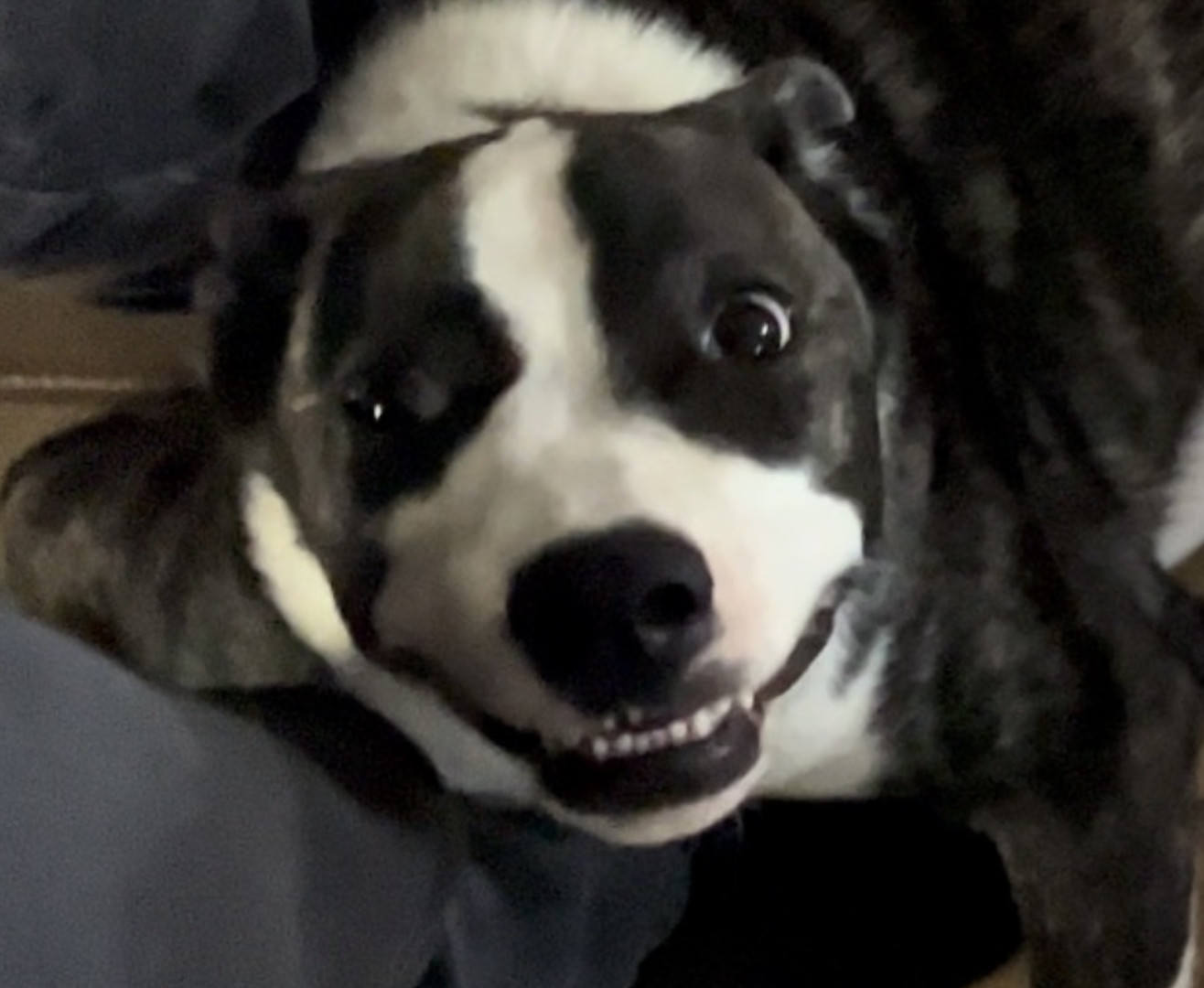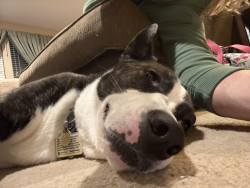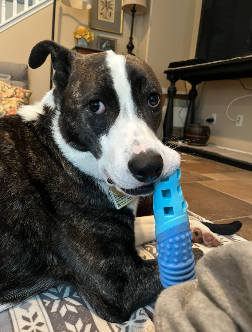 He has a great smile. He is very lovable, devastatingly handsome, slightly wall-eyed, a regal man-baby who was passed over at many adoption fairs before I fell for him like a ton of bricks. He’s a sweet soul whose bark is worse than his bite. He is very expressive and is a goofball. He loves to play and enjoys his toys. He is just the best!