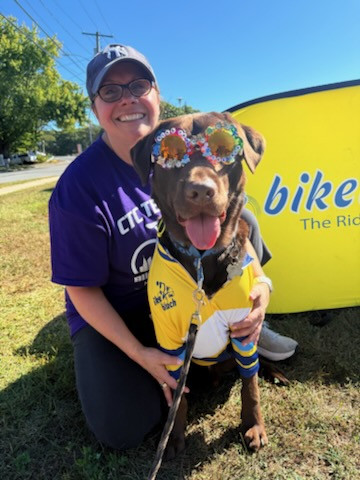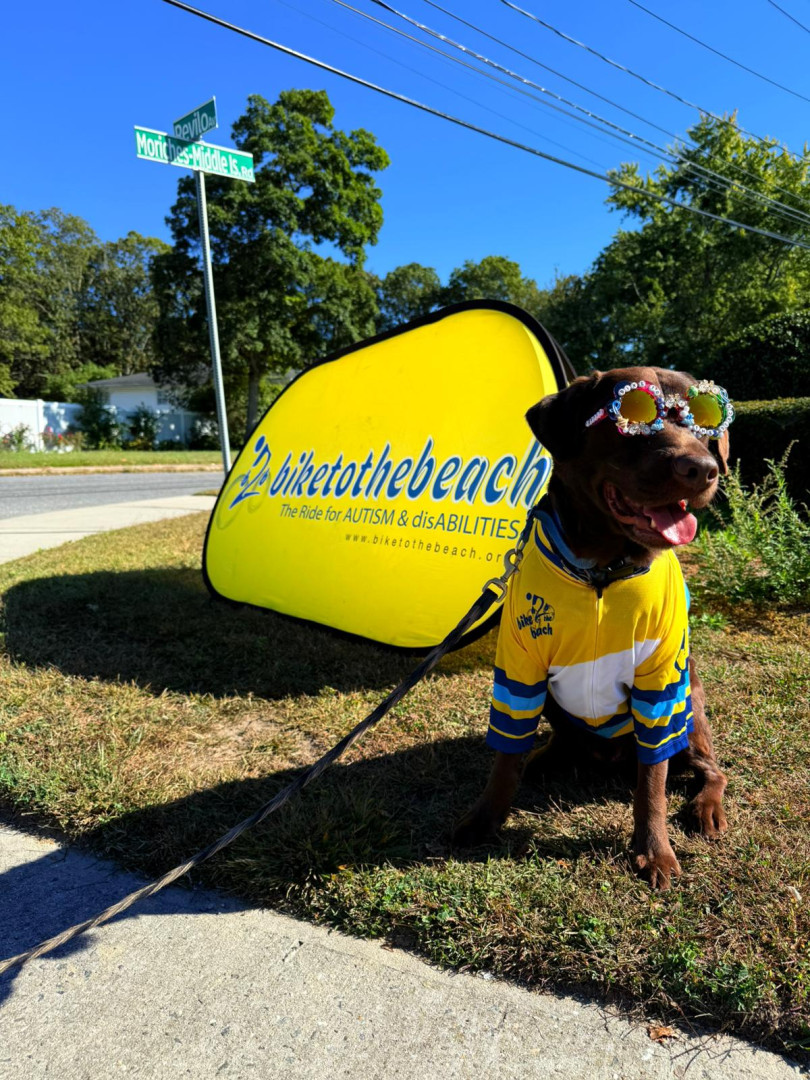 He is sooo friendly and kind. He loves to meet people and make people smile. Everyone in town knows him because we are always walking around the neighborhood and he has to stop to say HI and give kisses. People love seeing him on their walks and look forward to it every morning. He is such a joy. He was also the mascot for the Bike to the Beach NY 2025 event for Autism. Loves to dress up so he had on his own biking jersey and cool sunglasses and loves to take pictures with people.