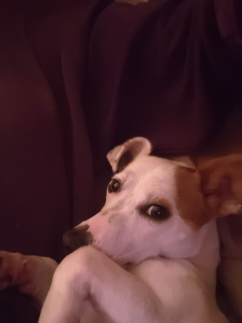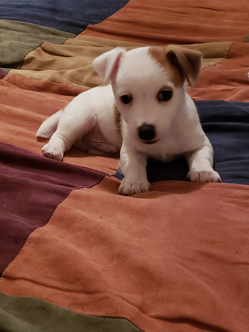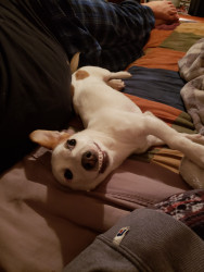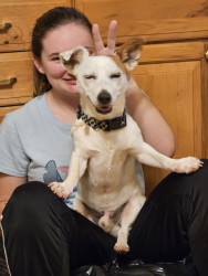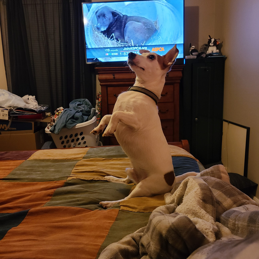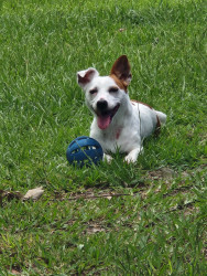 Jack is very hyper. Adores his human and feline siblings. Has a love/hate relationship with squirrels. Favorite past time is playing fetch.