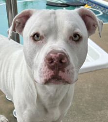 He is albino with beautiful pink skin w raspberry spots around his eyes and nose and body. At two months I received him because he was abandoned because he was albino and considered a threat to the quality of the RedNose bloodline.