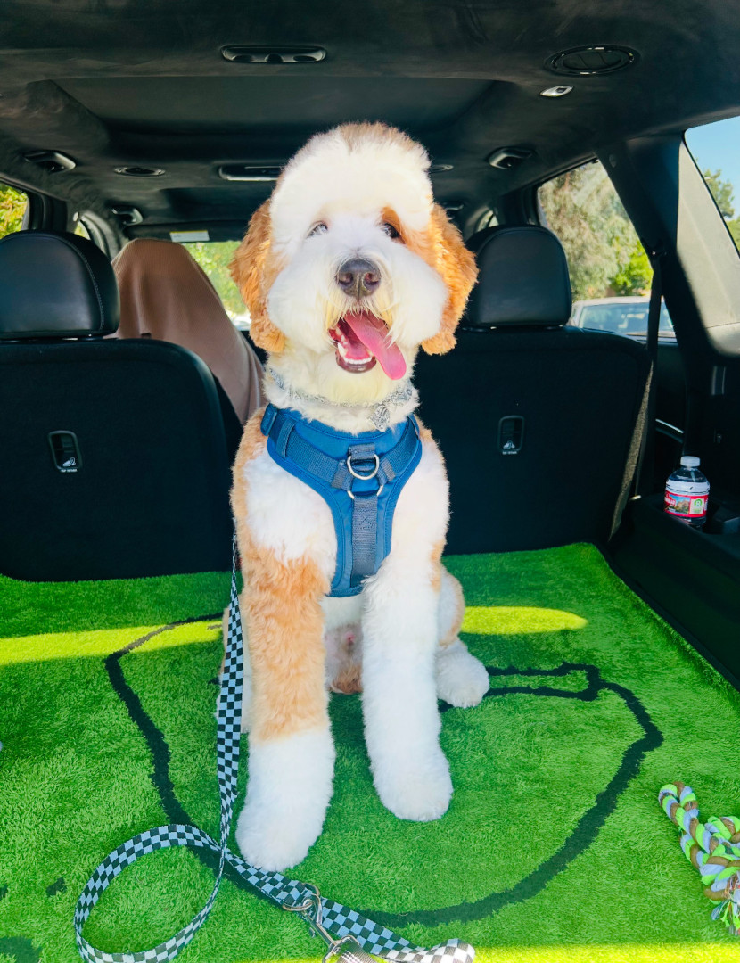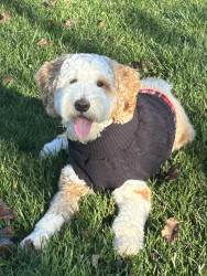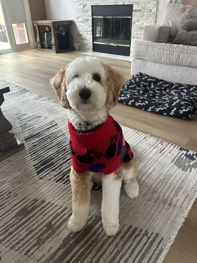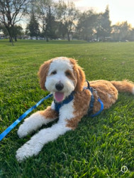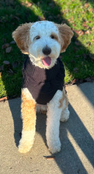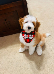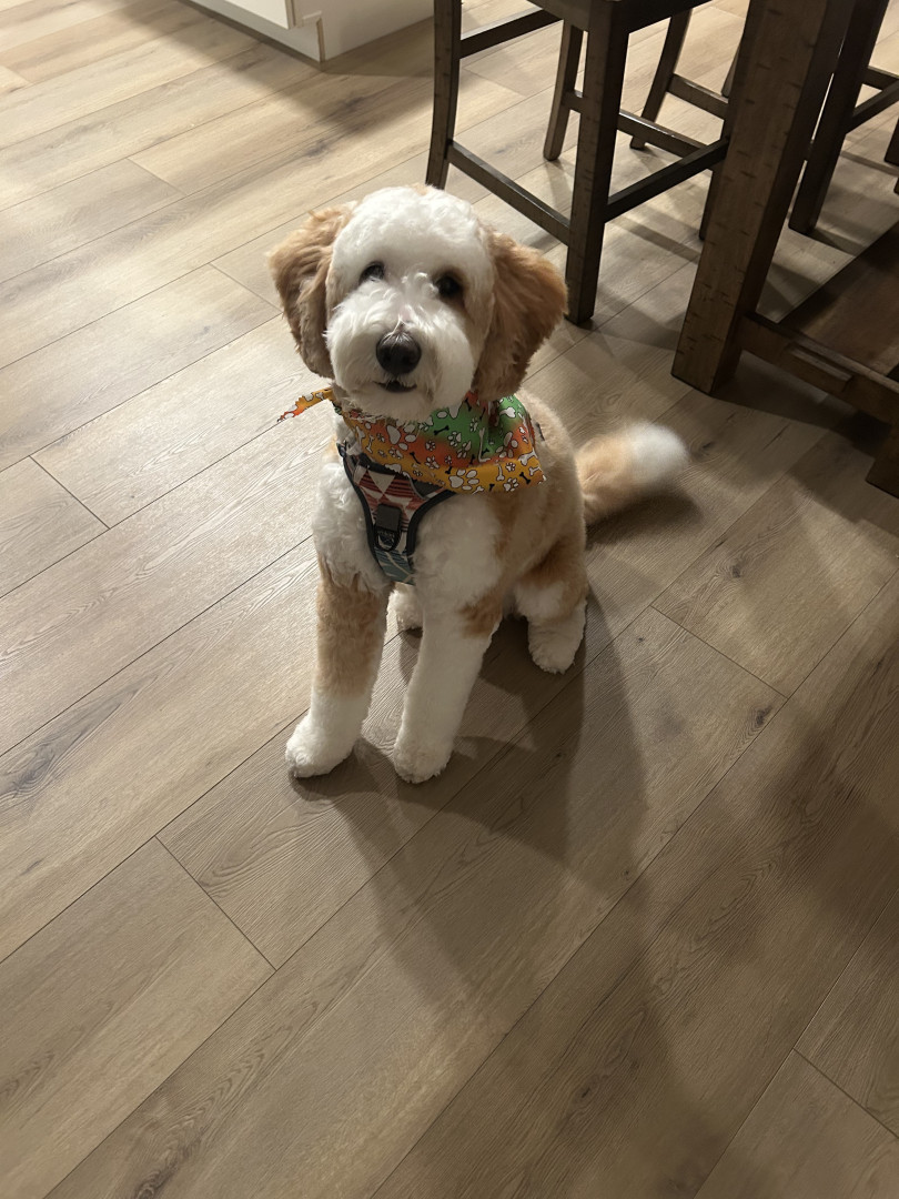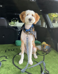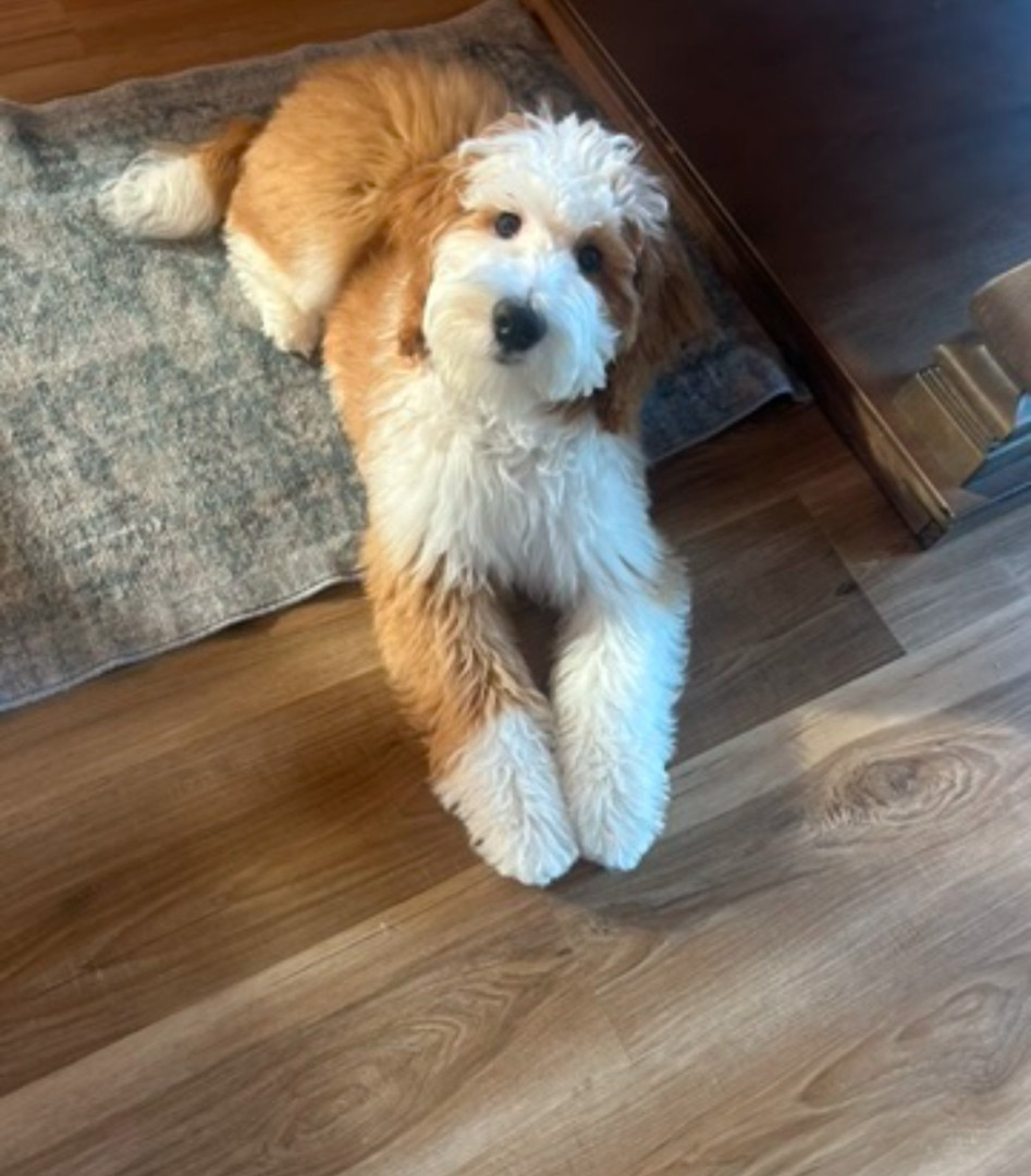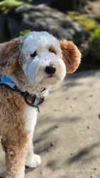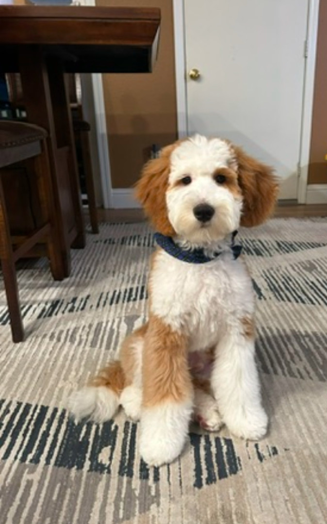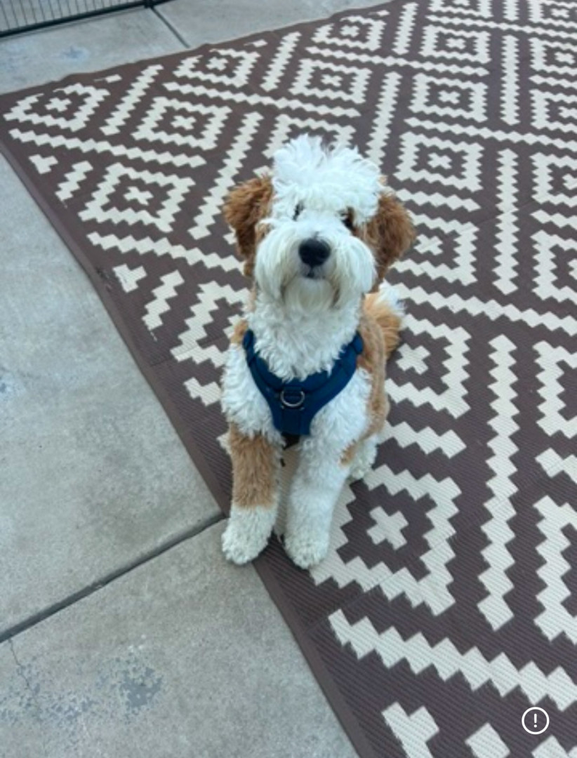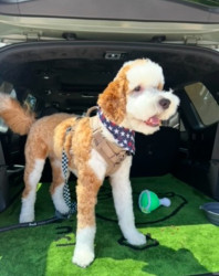 Jake is a bernedoodle with a beautiful brown and white parti coat with the cutest one eye patch which makes him very unique!
