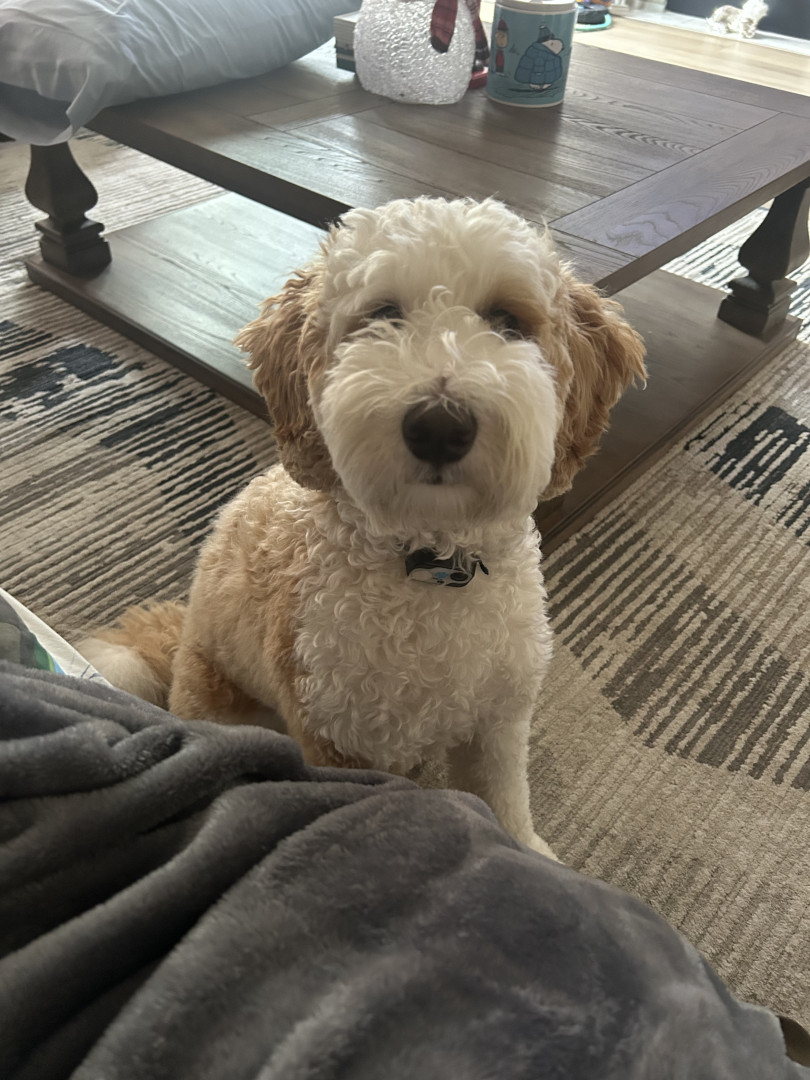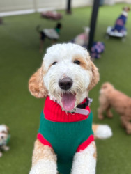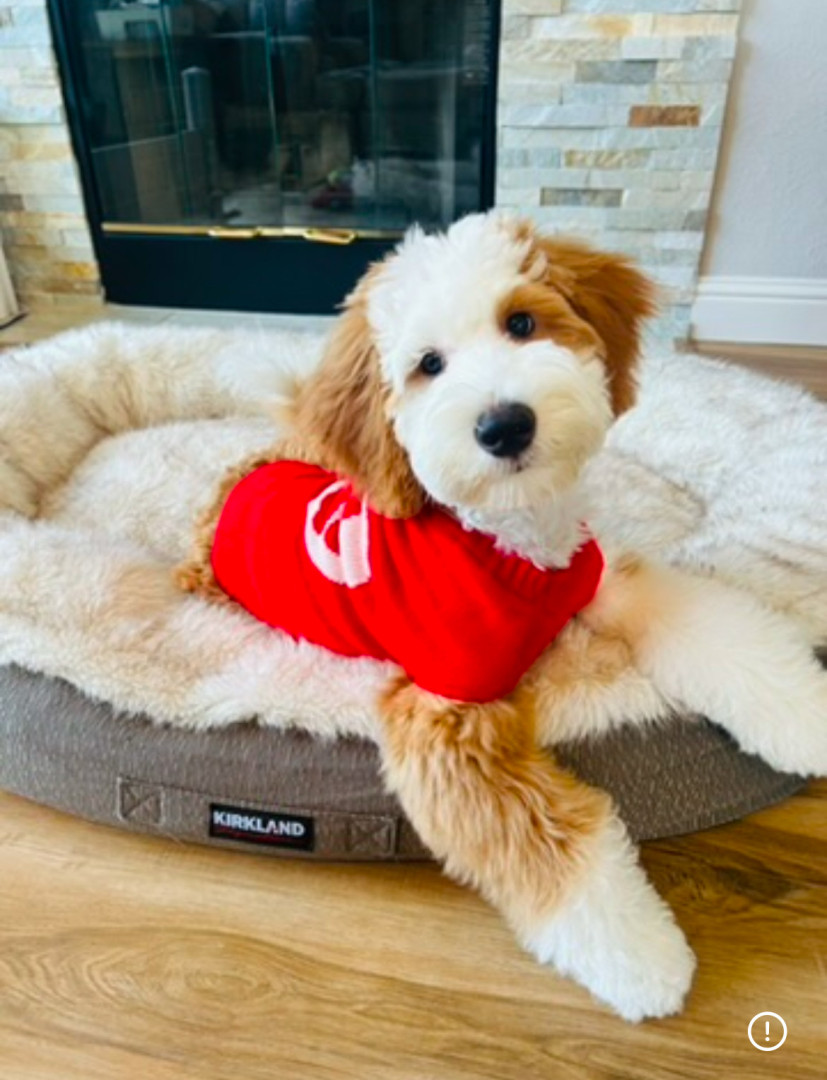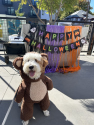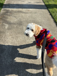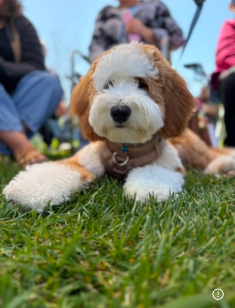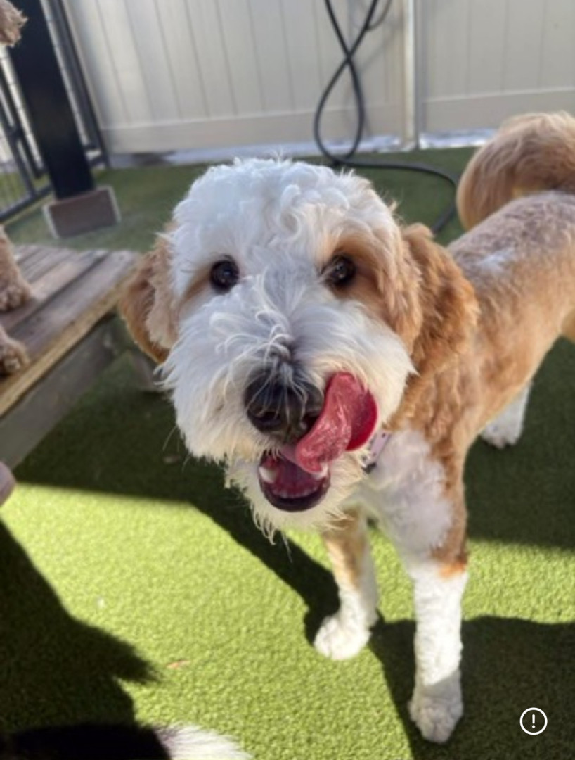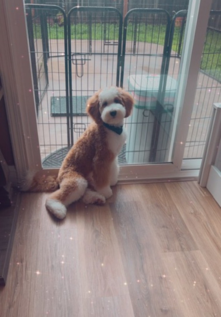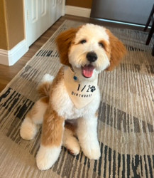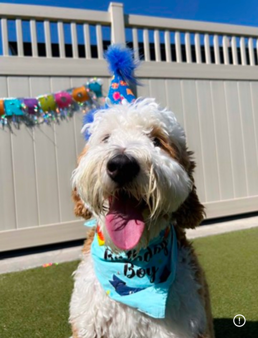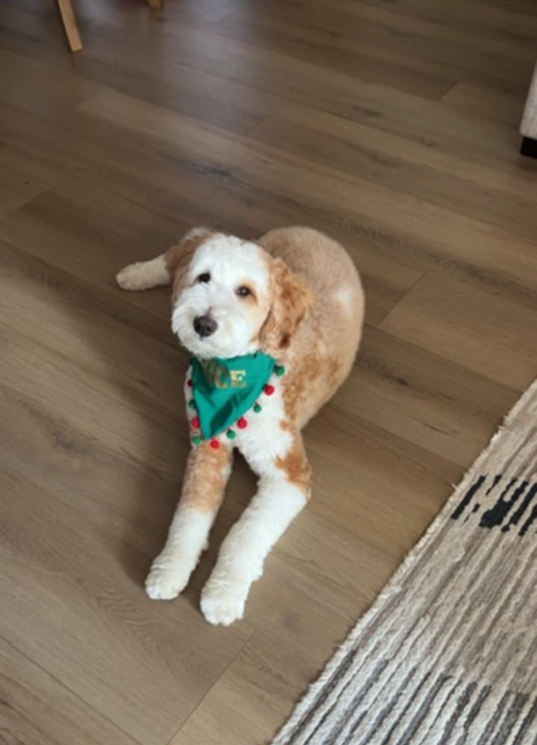 Jake is a bernedoodle with a beautiful brown and white parti coat with the cutest one eye patch which makes him very unique!