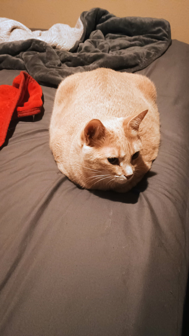 His name is actually Gizmo and he is a chubby light orange cat and he like to play with his brother Mike and he likes to eat