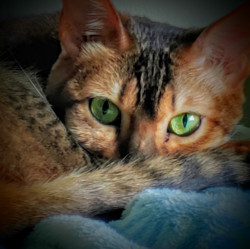 Java is a very chatty, 9 year old Bengal/Abyssian mix with beautiful green eyes