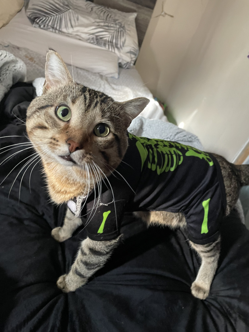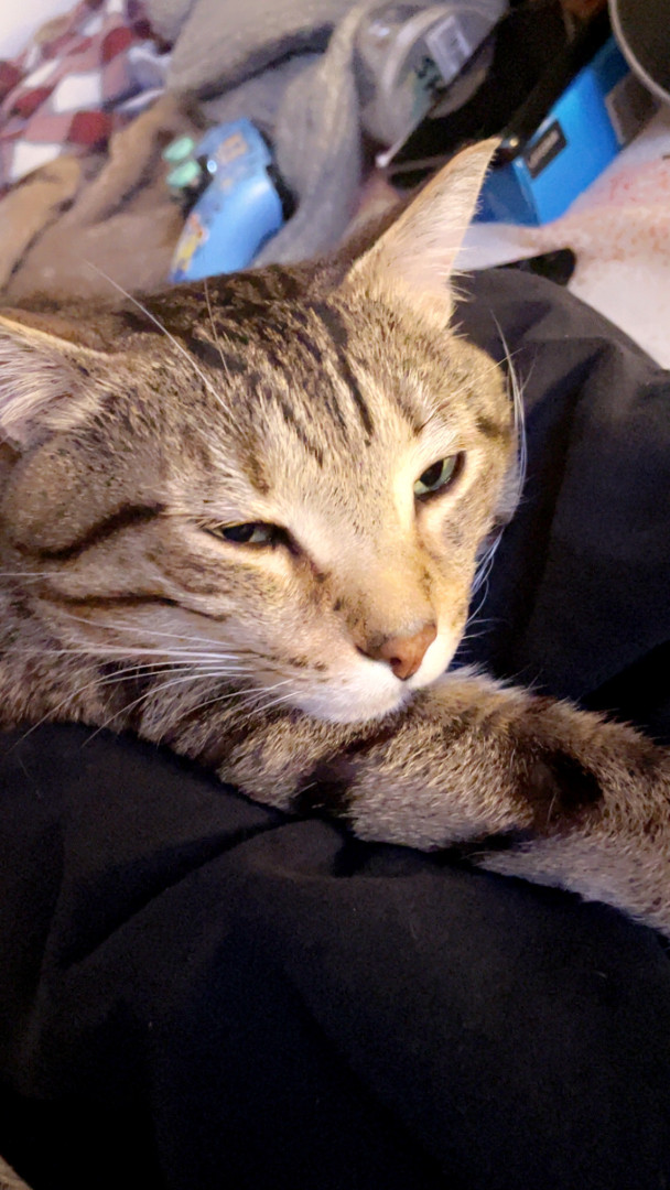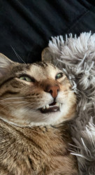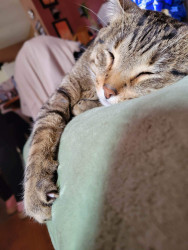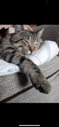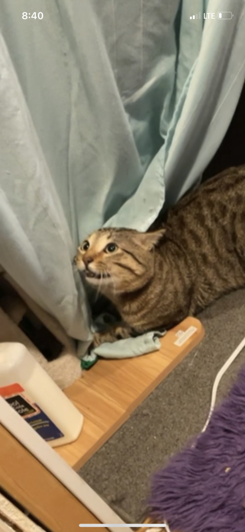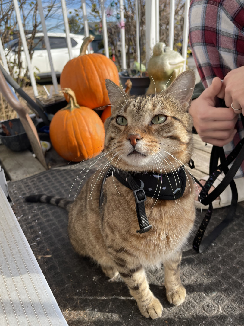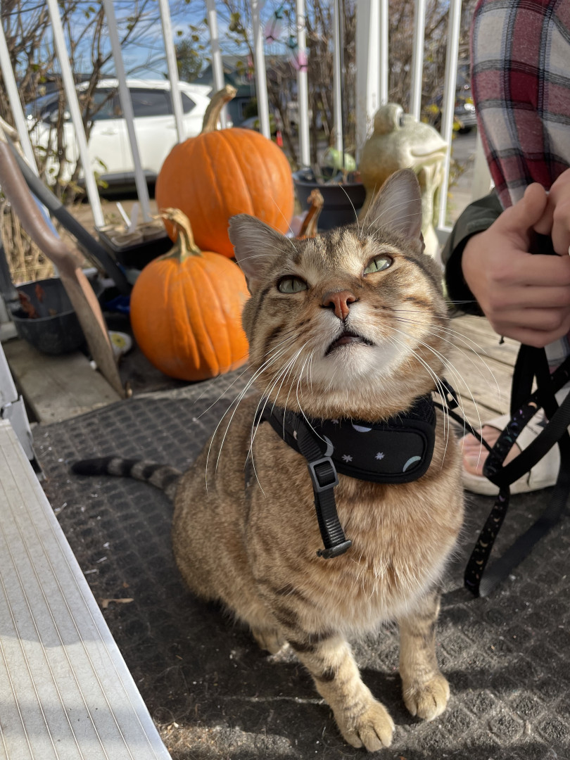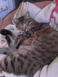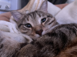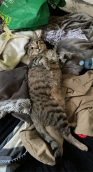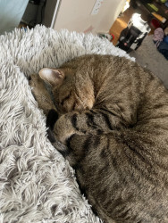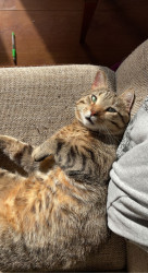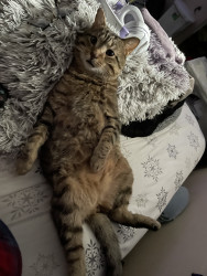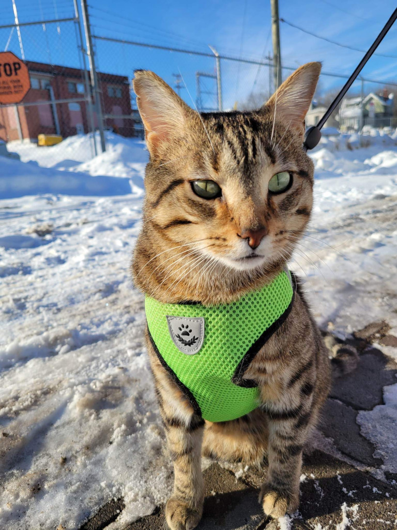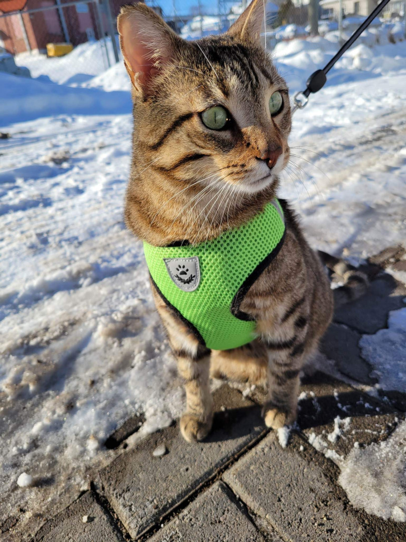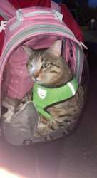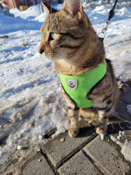 8 year old brown&black tabby, a sweet and a very distinguished gentlemen with the brightest green eyes. Indoor cat but loves going for walks
