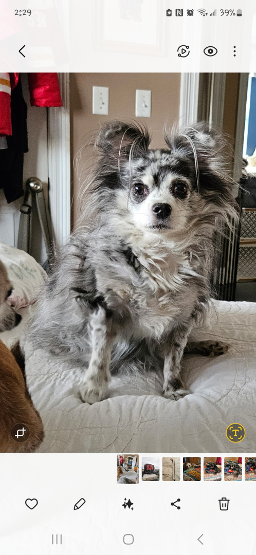 Jaxon is a Silver Merle Longhair Chihuahua..he is the sweetest most gentle little guy. He is 12. Jaxon loves belly rubs full body scratches.