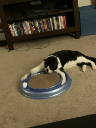 Mr. Catsby loves playing with his little green, fuzzy ball that he's had since I got him 8 years ago. It's ratty but I keep sewing it up for him since he loves it so much. His go to treat is lunch meat ham.