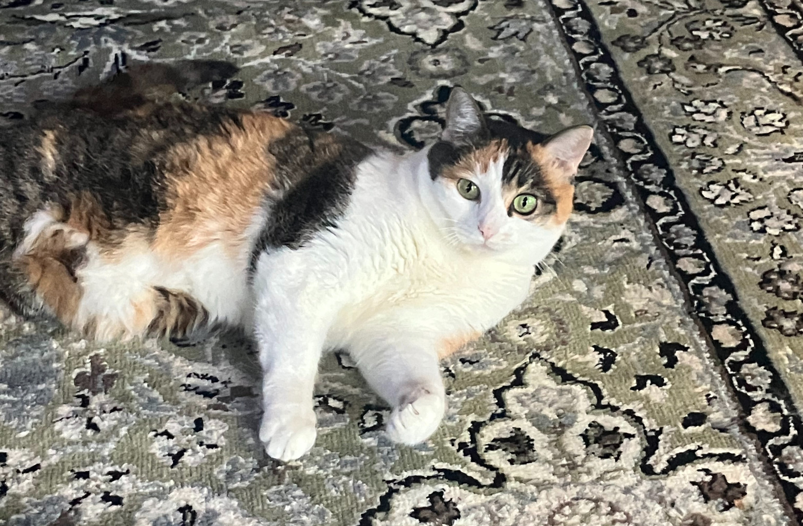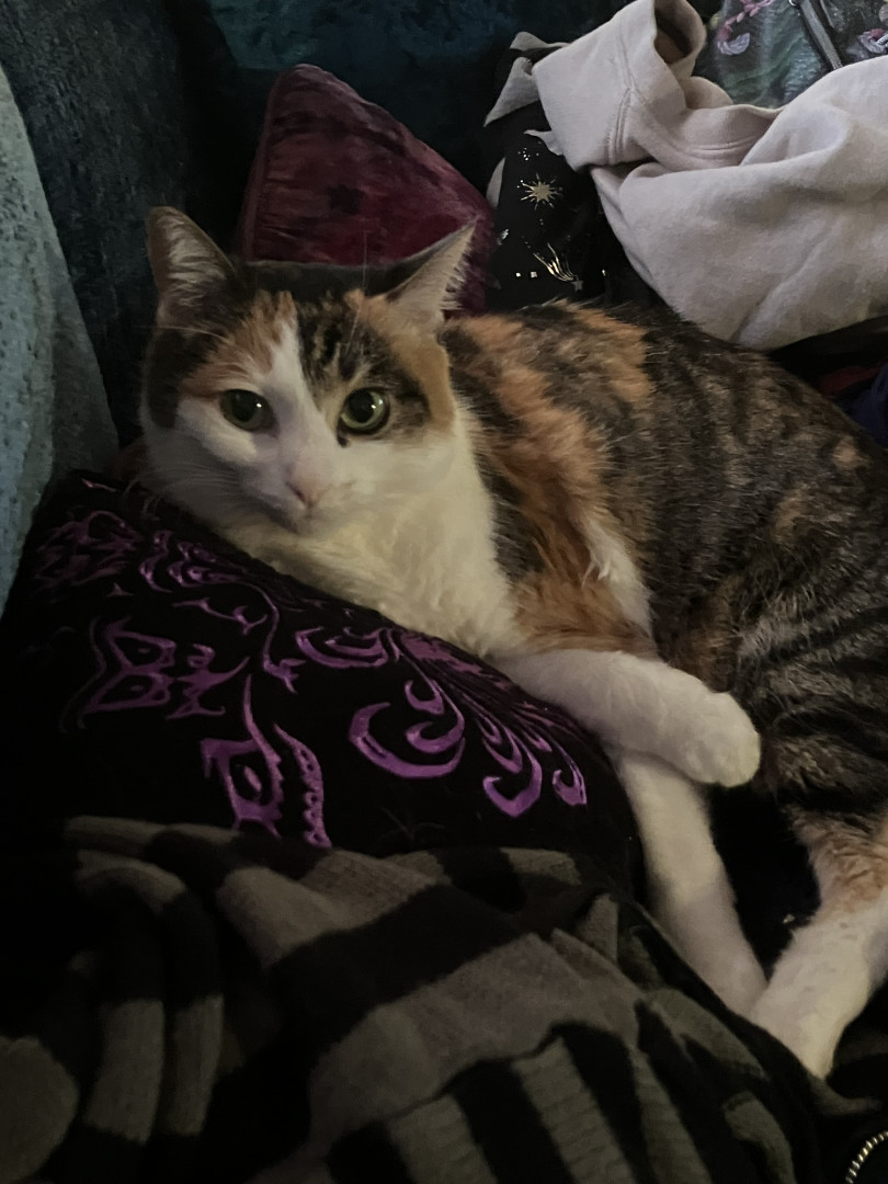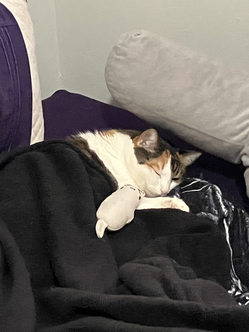 Jazzlyn Fiona was a stray mother cat when she was rescued. She is quirky, sensitive, and playful. She loves snacks and pillows.