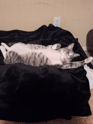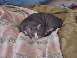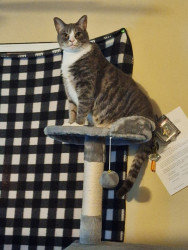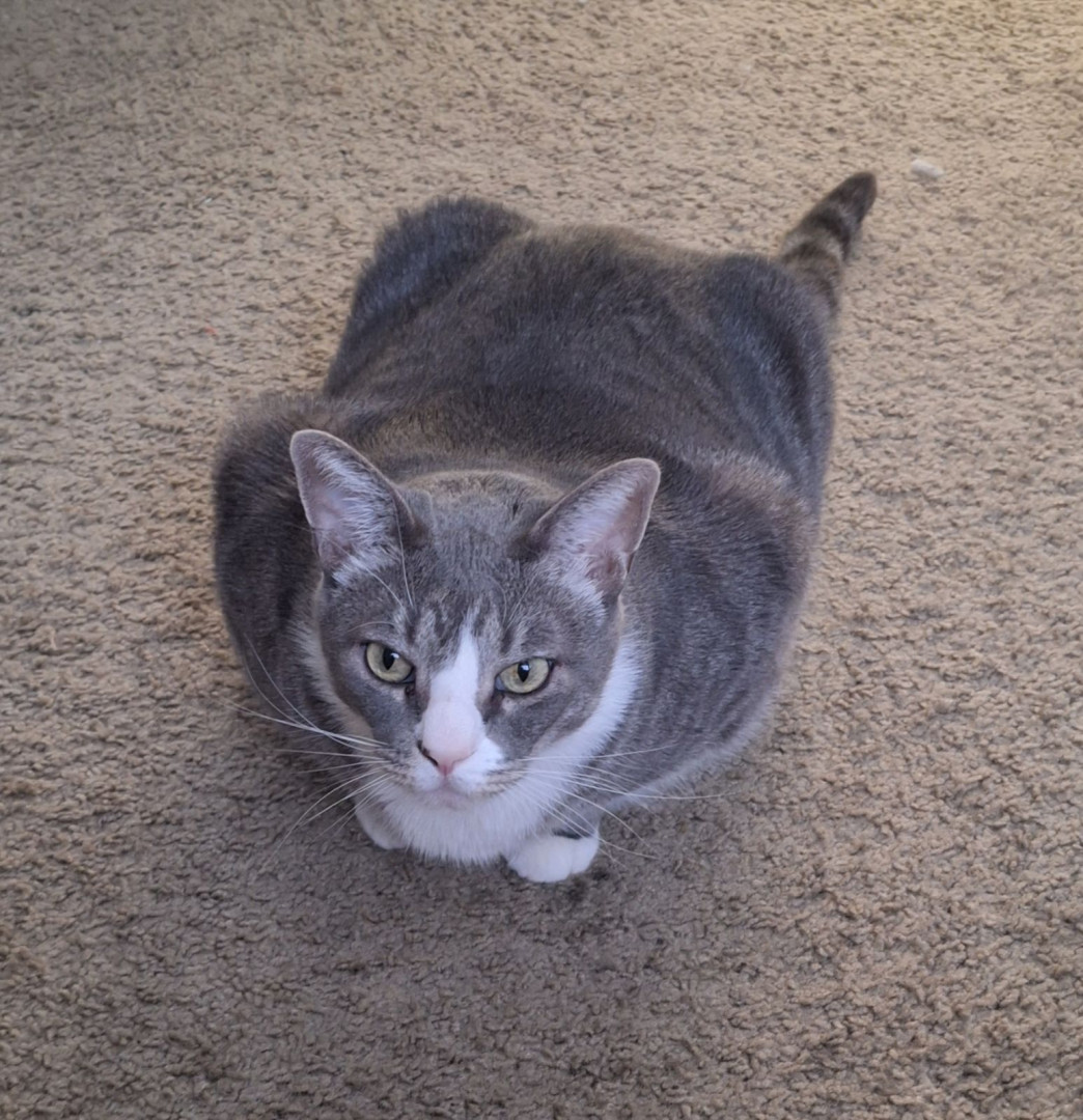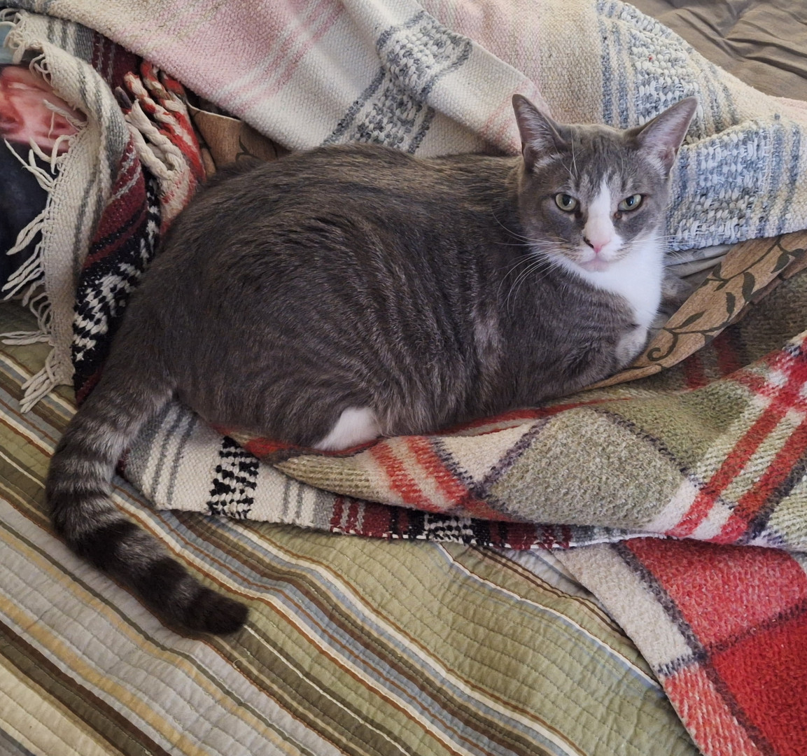 Jon is a gray and white tabby, soft like velvet and very affectionate. He loves us and is super clingy during cold weather.