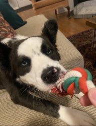 Her extra large lamb chop or squishy indestructible Jolly ball. We take her to the baseball field to kick it and she catches in mid-air. She is incredibly fast!