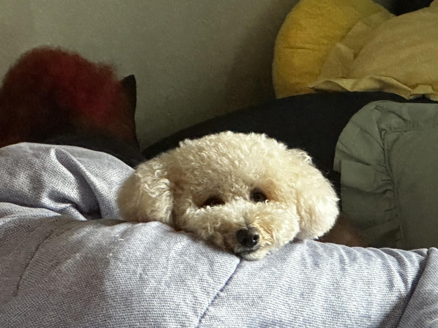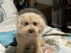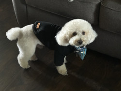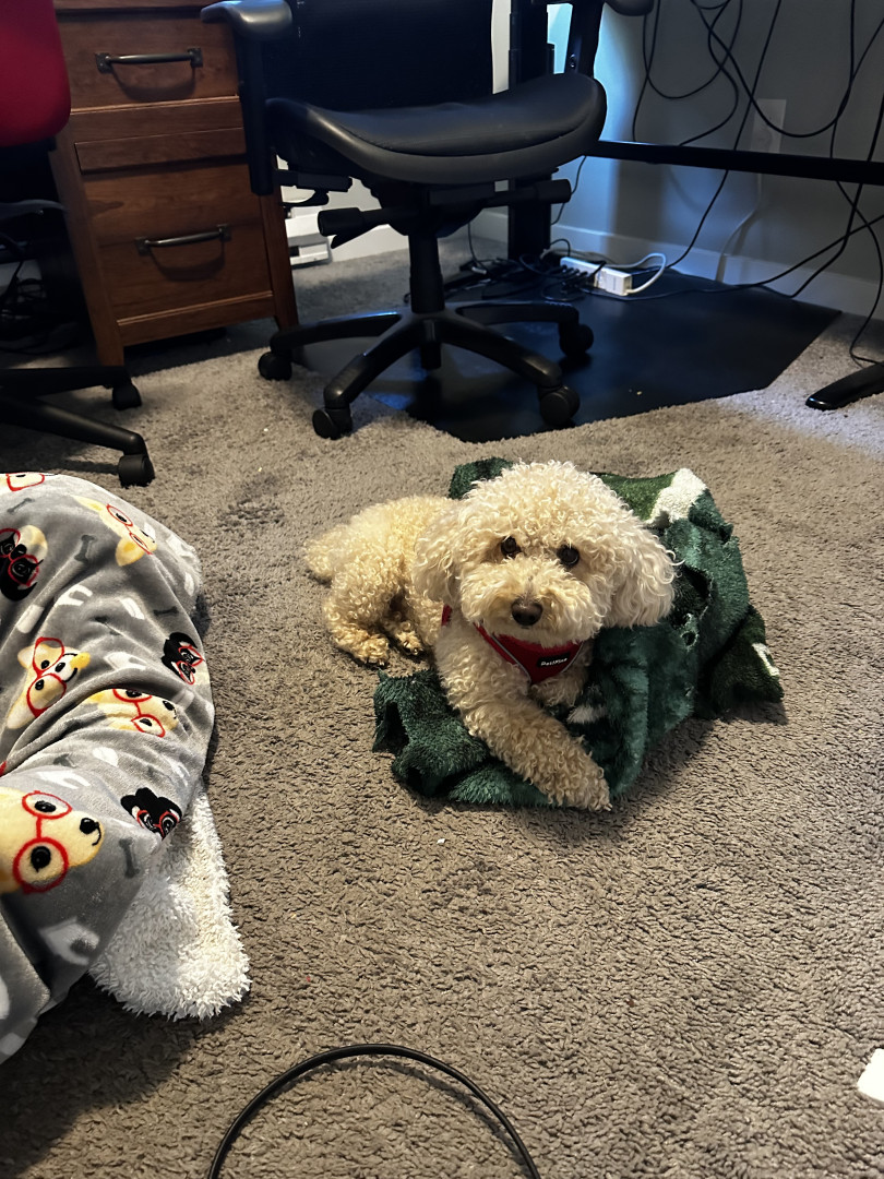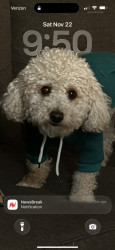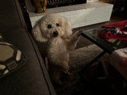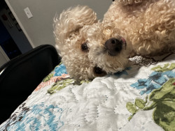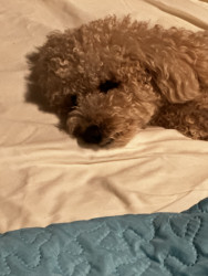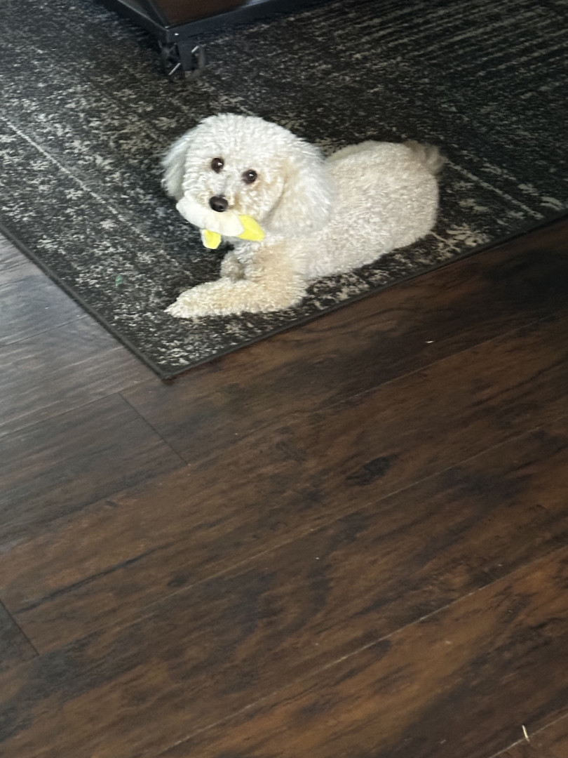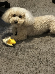 Juice is a toy poodle, who loves to cuddle. Gives lick kisses, and lays his head in your lap. He has daily zoomies, plays fetch, and is FAM