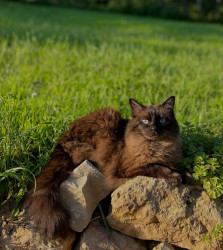 A gorgeous long-haired cat with a rich chocolate coat, bright blue eyes, and a fluffy tail. Elegant and photogenic, yet fun-loving, curious.