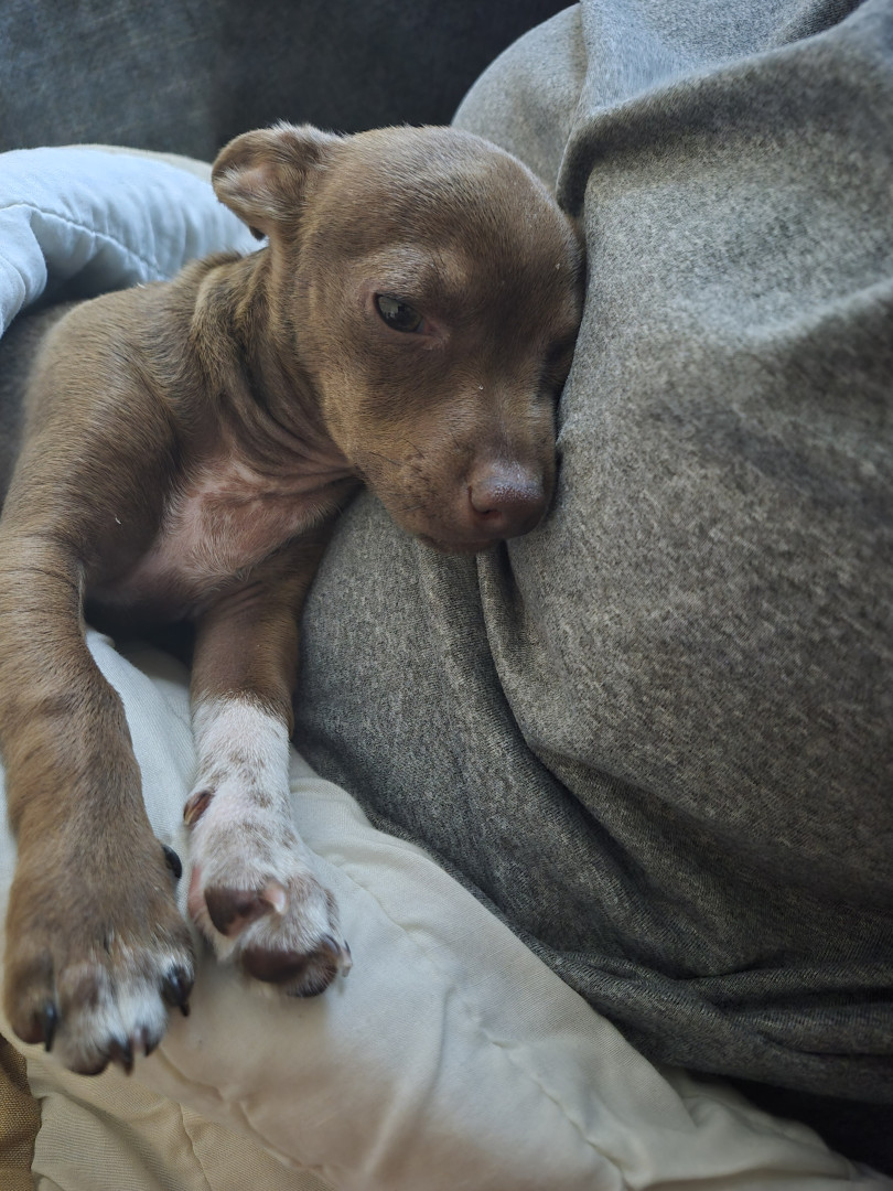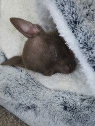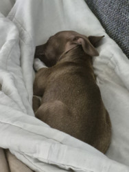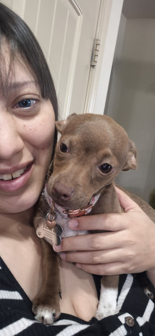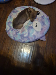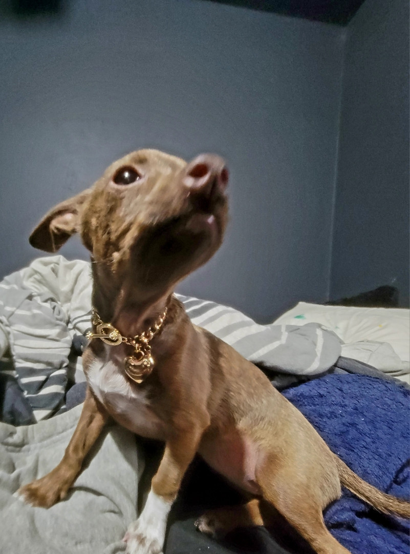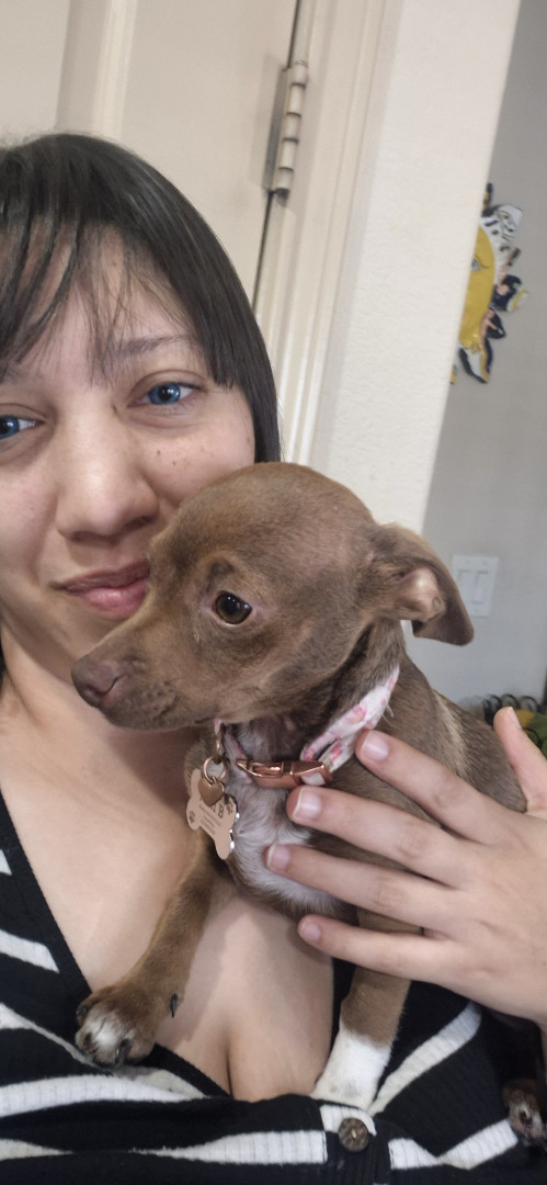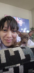 She loves cuddling very playful nervous around other animals she'll bark sometimes she's mostly quite she's nice she like to take pictures