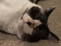Her adorable feet resemble bunny feet and her godzilla like fur when she's either frustrated or super alert..