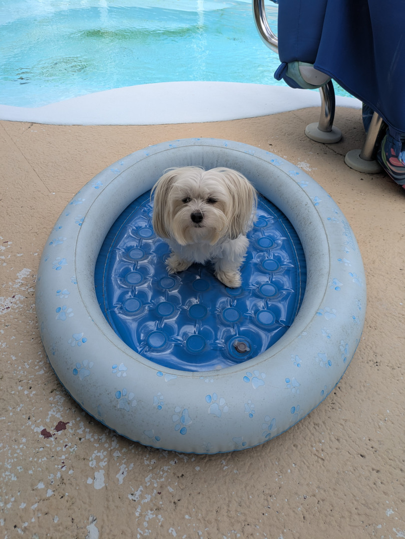 He is a rescue. And only him and his sister survived birth, out of a litter of four. When we are in the pool, we have his puppy float on the edge of the pool. When he wants to come in, he jumps in the puppy float to let us know that he is ready to come in the pool and float around.