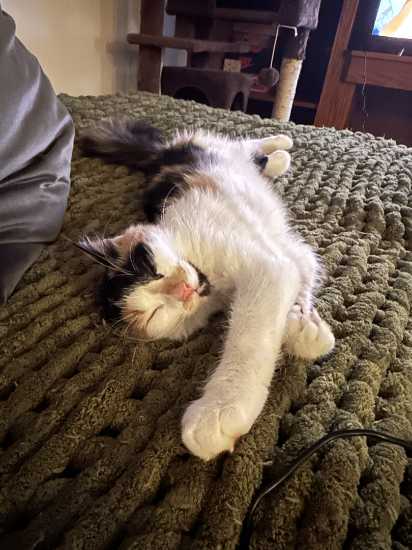Kali’s unique talent is her ability to squeeze herself under or into any reasonable space like a liquid with fur. If there’s a gap, she’s in it. And when she’s making biscuits? Full focus, maximum drool. Equal parts graceful contortionist and very committed baker.