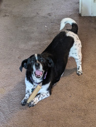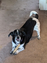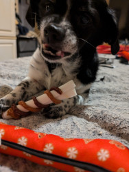 Learn MoreKali doesn't really play with toys anymore. She will sometimes chew on what we call her "boney bone" and she plays this game where she acts like she wants to give it to me but when I try to get it she acts like it's making her sooo upset and starts whining or growling but it's a fake growl and her tail gets to wagging so hard she gives herself away every time. It's her "boney bone" game.