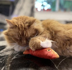 Learn MoreHe loves greenies and his floppy fish! He lays on it and kicks with his back paws then rolls all over it, him and his fish are two peas in a pod.