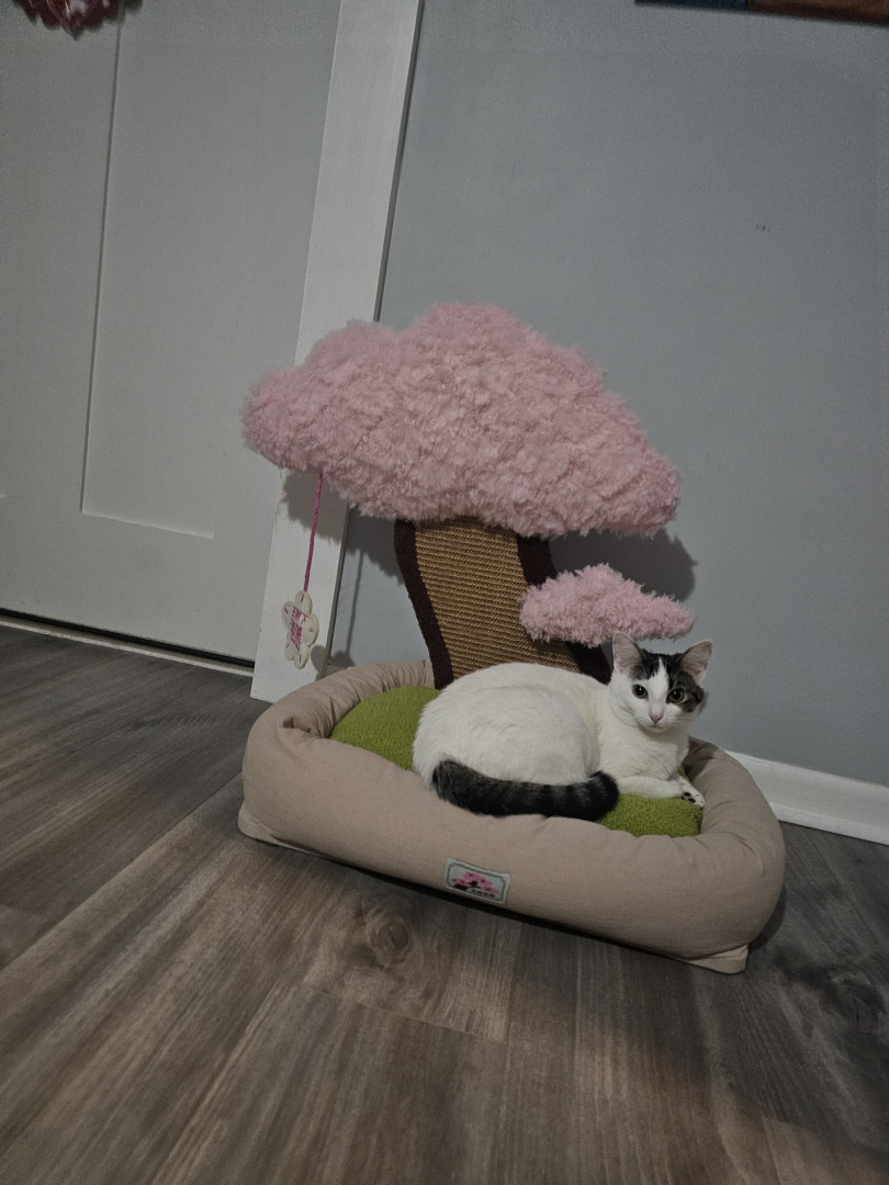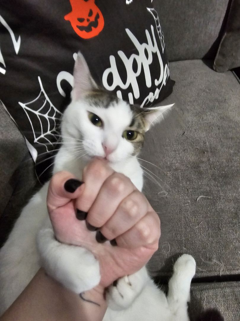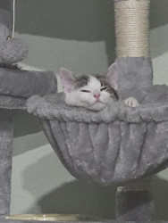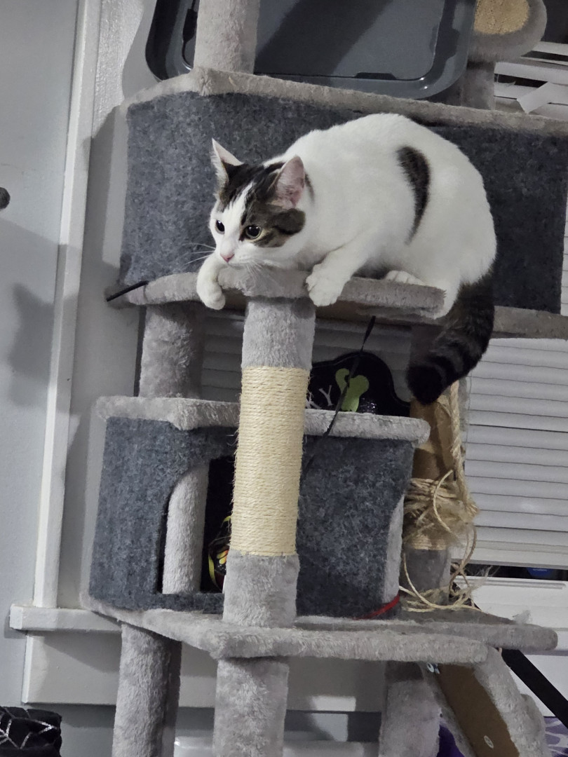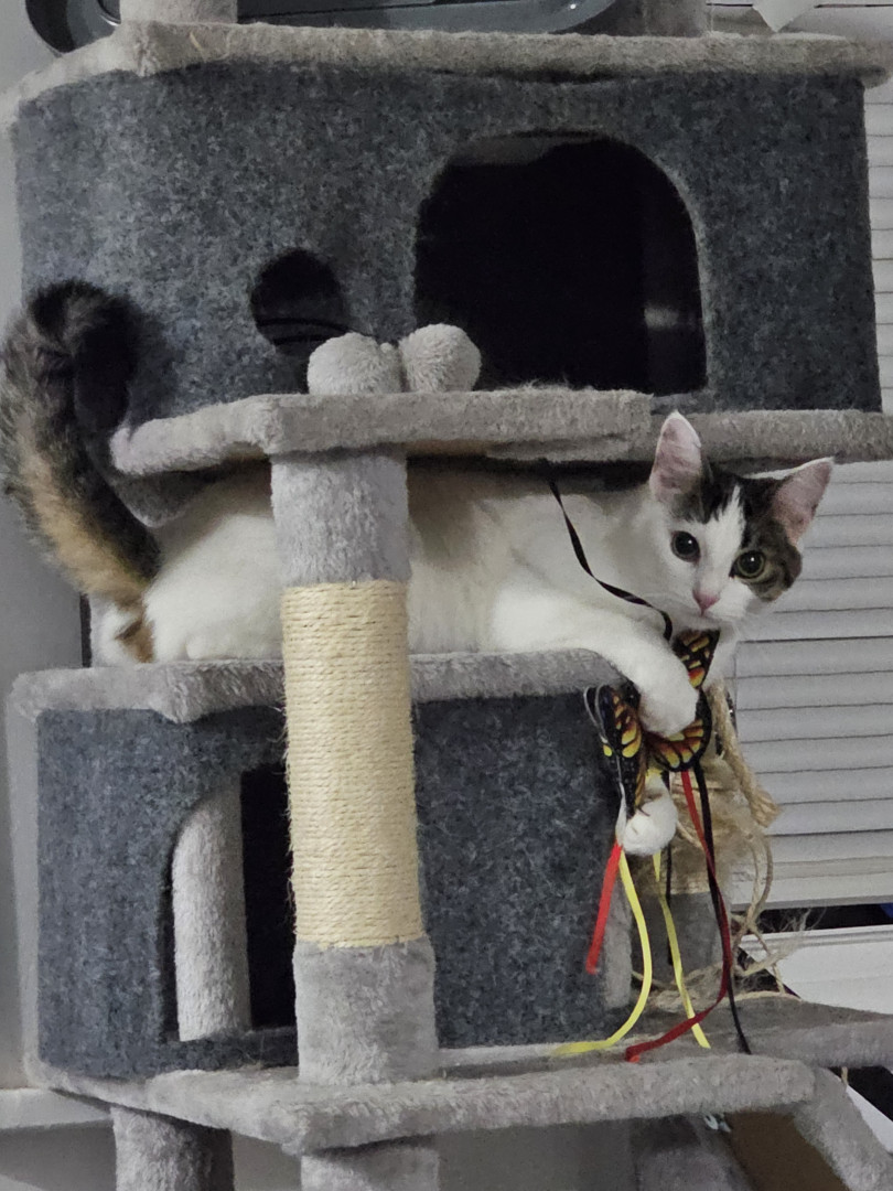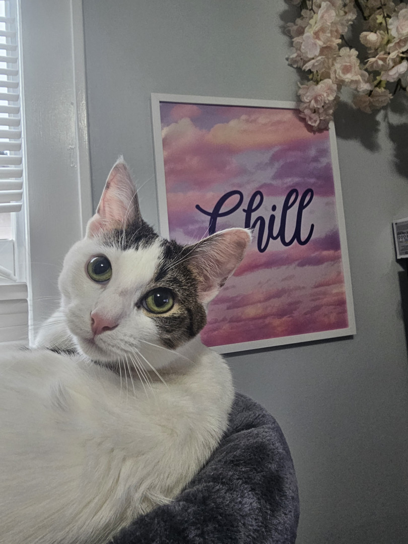 Khloe should be America's favorite because she has so many amazing qualities! She is so sweet and cuddly. She loves laying underneath the blankets to cuddle. She also is very playful! She loves playing with her siblings and running up and down the cat trees and all around the house. She loves grabbing my hand and giving playful love bites. She also is so adorable! I call her the "Prettiest kitty at the party" all the time. She is just an all around amazing cat!