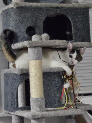 Khloe's most unique quality is that she can jump super high! I will be using a toy that has a string attached and have it up high in the air and she will jump so high just to grab it! She also can jump almost to the top of a cat tree from the floor.