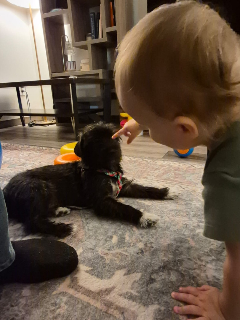 Kimball is full of personality and is so cute. He has helped me tremendously with my grief of losing my husband who passed this summer. Kimball is his namesake. In the photo he knew instinctively that Riley was a toddler and let him pat him & stayed calm, and didn’t steal his toys and jump on him.
