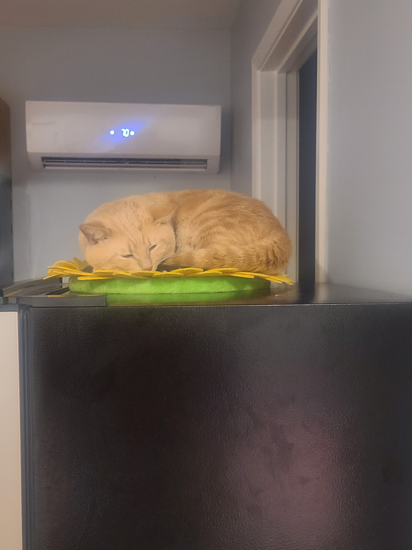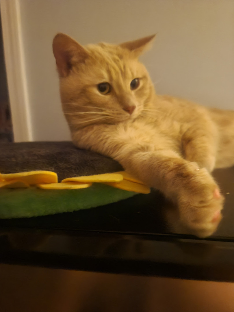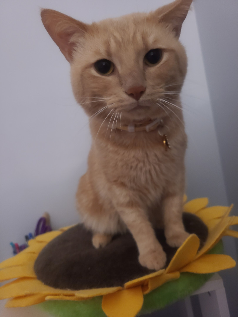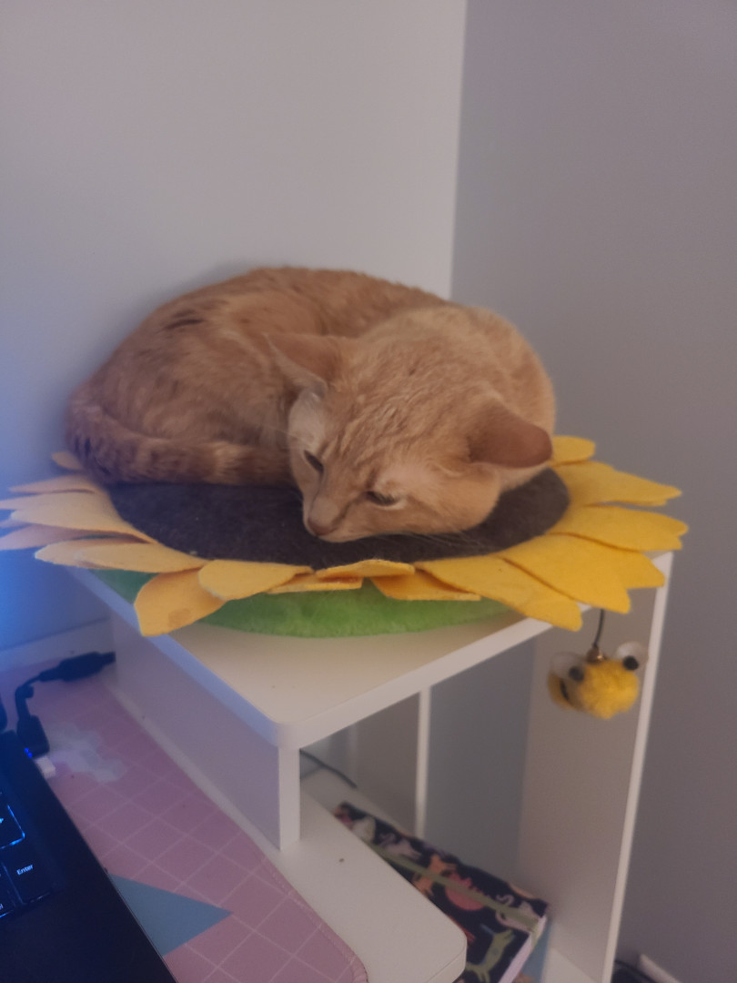 Kion loves sunflowers! I noticed this odd quirk when I got him a sunflower scratching post. He refuses to scratch any other scratching posts. I save the sunflower tops- and he sits on them! He even has a sunflower bed he just adores.