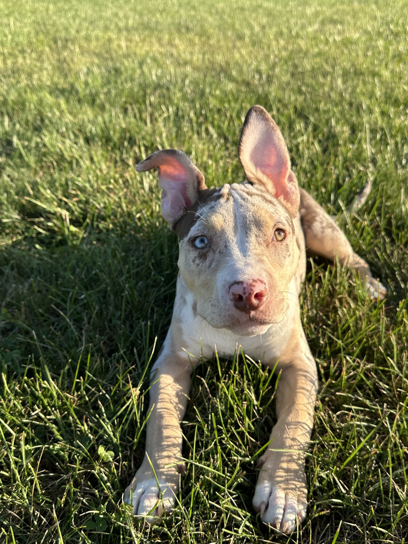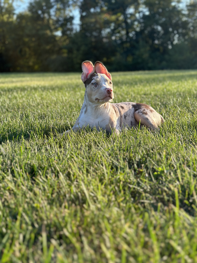 kioura is it all she a friendly, loving, super playful pup. she has a unique personality. she is one of a kind let me tell you. she is an american bully a chocolate tri merle to be exact. most say a lot about this breed but i would never have another breed after her. the personality and attitude they definitely hold up to the “BULLY” name in the best way lol.