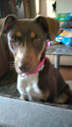 Kiss is a Australian shepherd pitbull mix she's my emotional support dog,I have stage 4 cancer she sleeps with me and wakes me up of I s