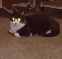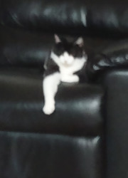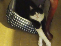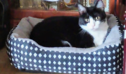 She is quite the introvert. When she lays down she sticks her legs out and sometimes she's crosses them. She is just now really coming out of shell. But her most unique quality is she is a Tuxedo cat, with a mask and two teardrop shaped black spots on her mask.