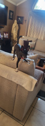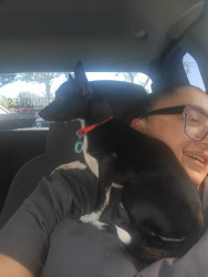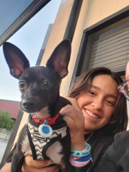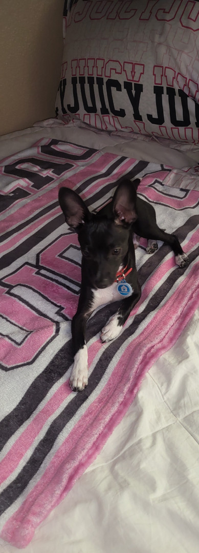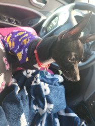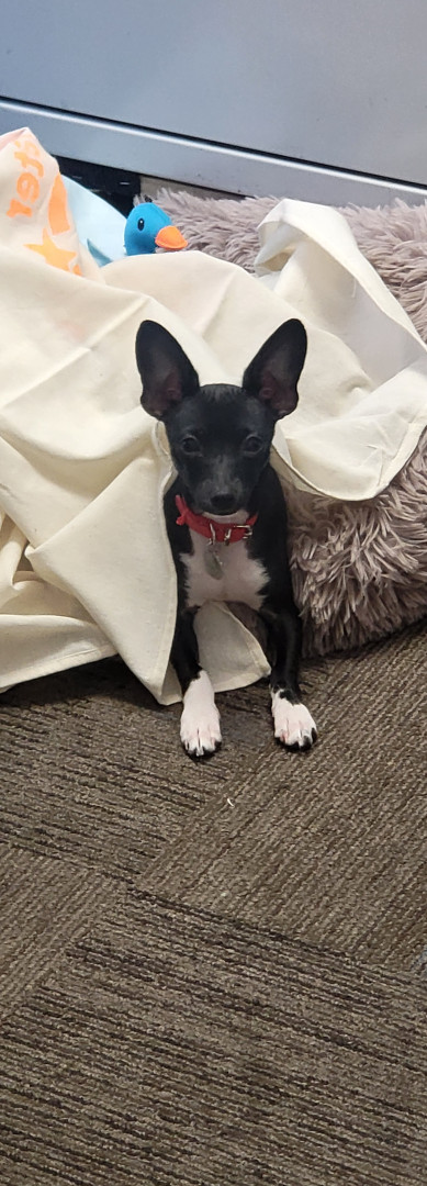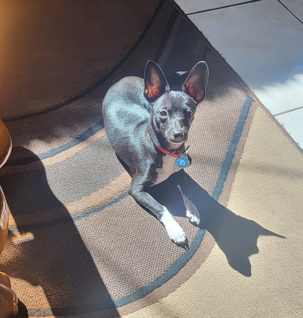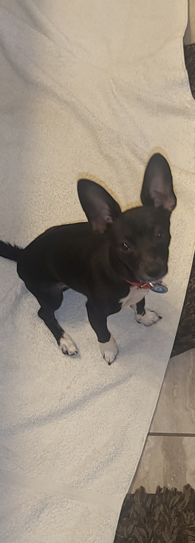 He's a short haired black chihuahua with white stomach white tip tail and white feet and lots of energy.
