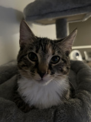 Receive Text UpdatesKoda’s favorite toy is her cat springs, her cat siblings, and any box/tunnel that she can run and jump in. Koda loves to eat salmon treats and has gotten into the treat bag once or twice! She loves to wrestle with her siblings and then calm down with cozy cuddles that are purrfect.