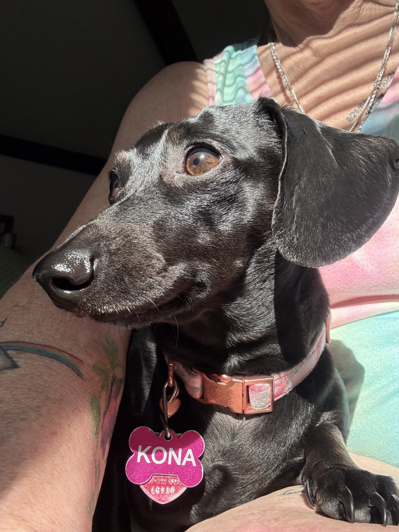 Kona is a rare all black mini dachshund who is my best friend. When my husband died almost 2 years ago, she mourned her Daddy also. She is beautiful inside and out!