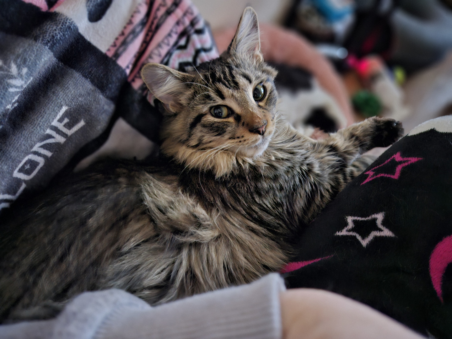 Her sweet personality. She gets along with everyone at home and loves to cuddle.