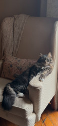 She has a high pitched meow which is more like a sung note on an A6. She enjoys being perched on the baby grand while voice and piano lessons are being taught. She also loves the snow, as any other Maine Coon would!