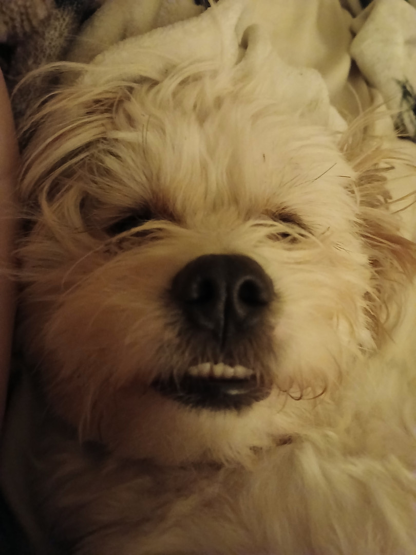 Laramie smiles when he's relaxing. Full teeth exposed!