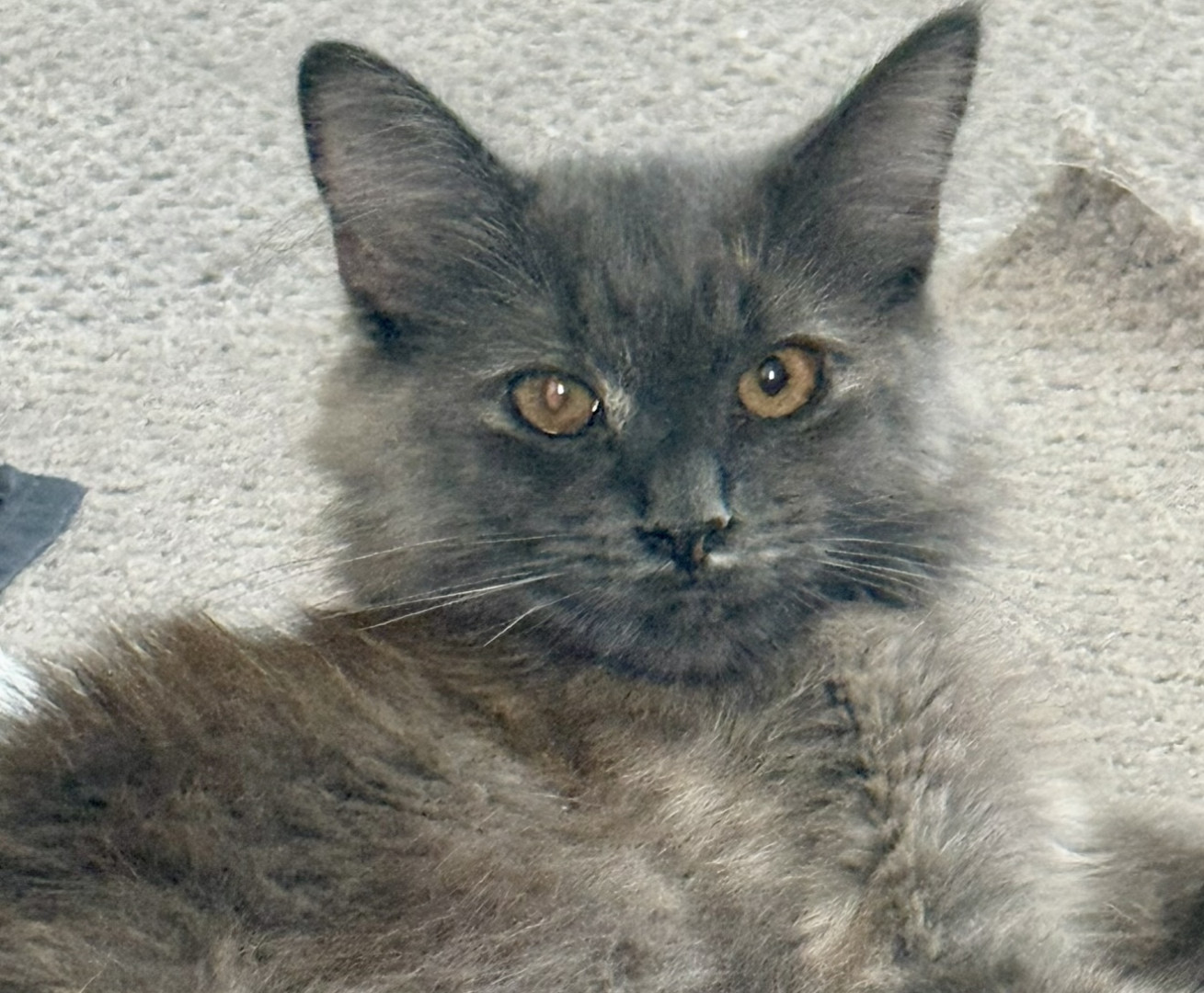 She is a beautiful long haired cat. She loves our granddaughter and follows her around the house. She will go lay in her bed room when she goes to sleep and will watch out the window when she leaves for school.