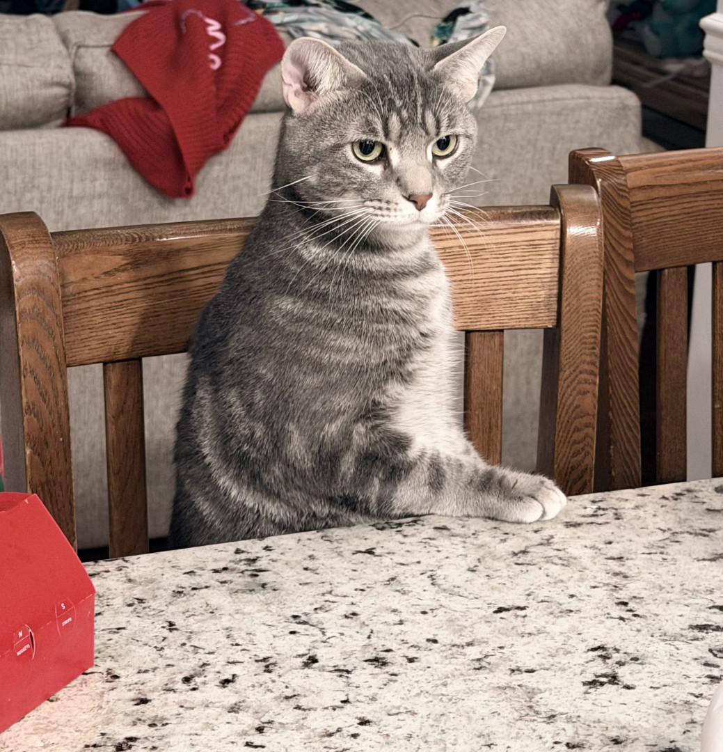 He is so sweet, cuddly and talkative but also a menace to society! He is a sour patch kid! And patiently waits to be served. Lol