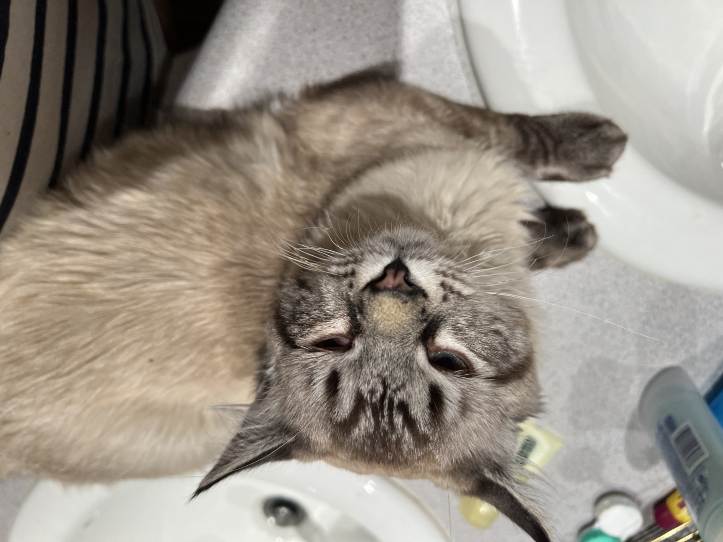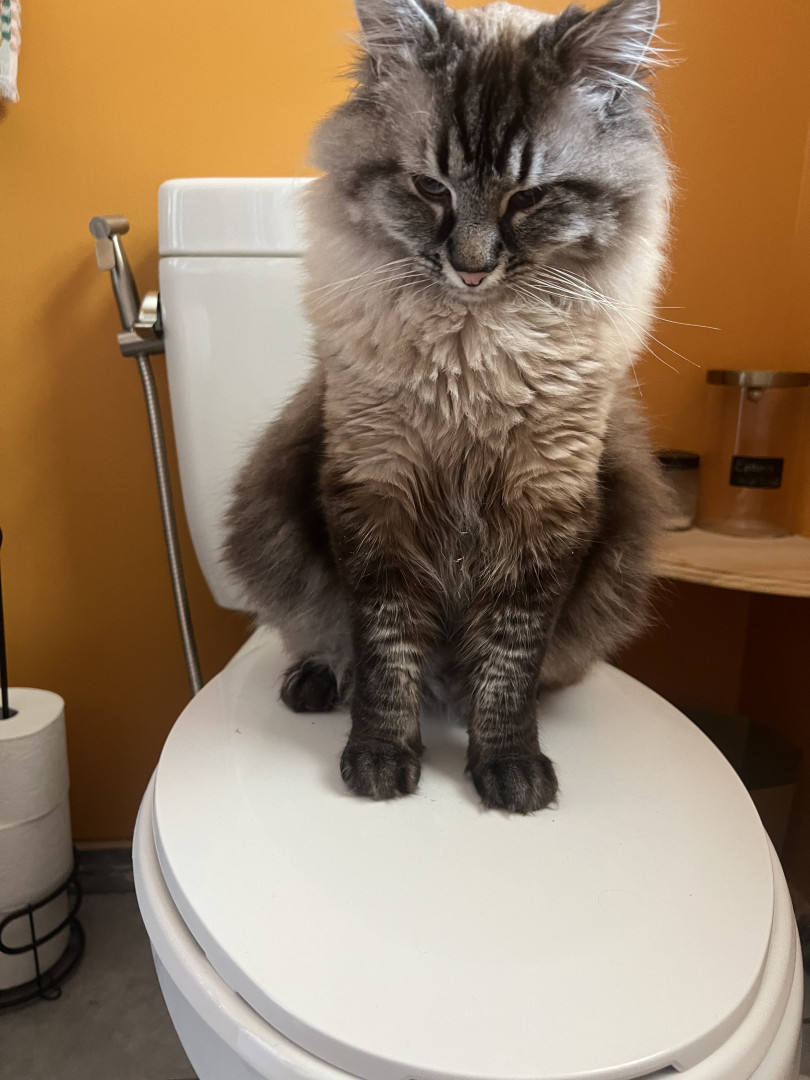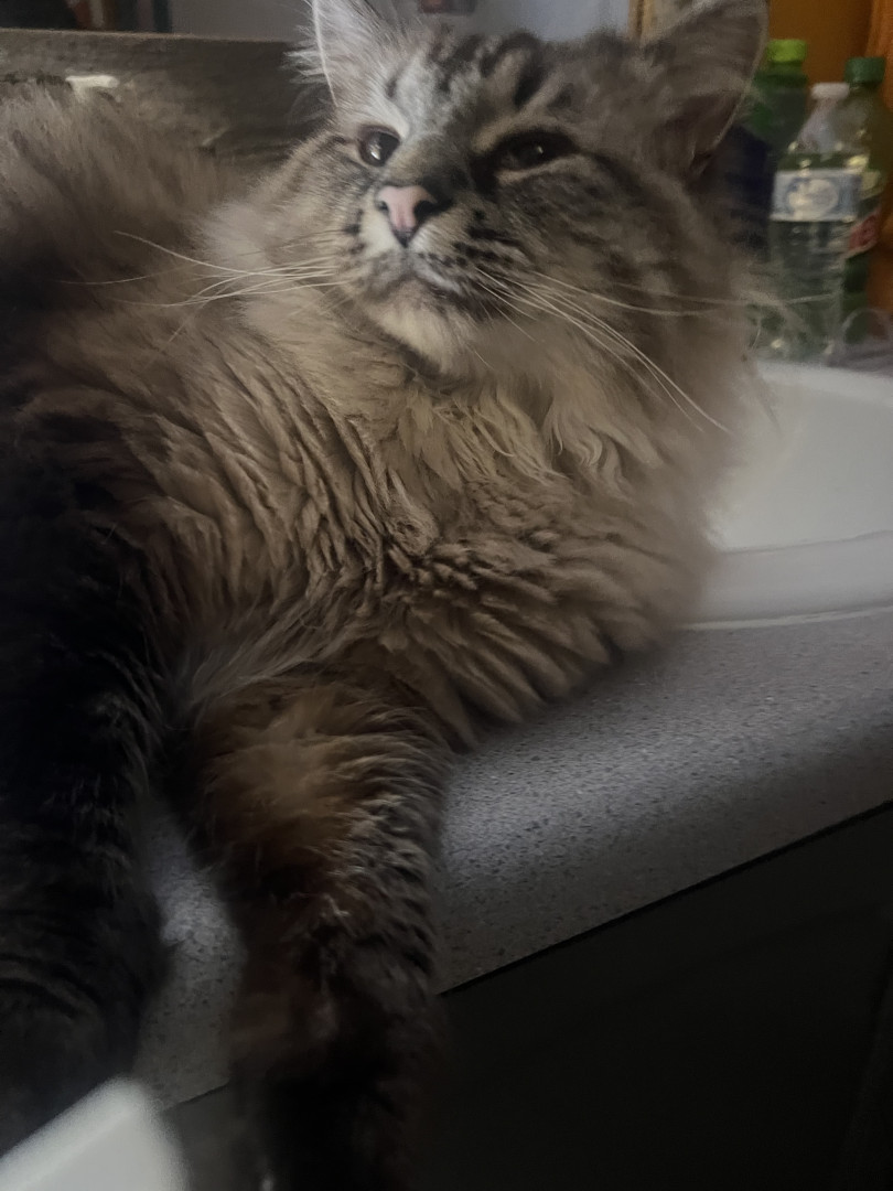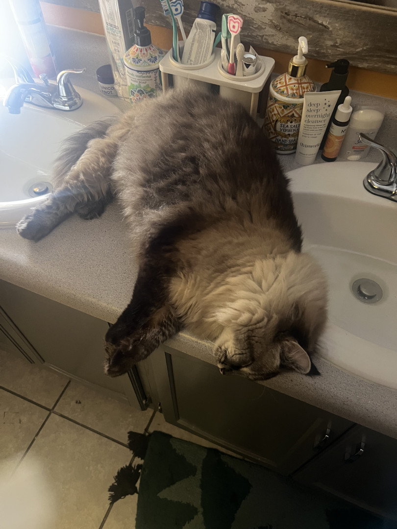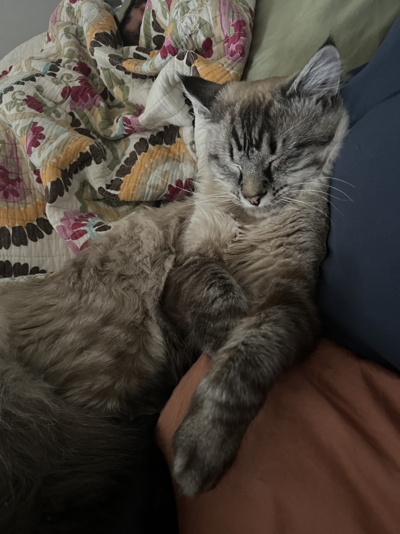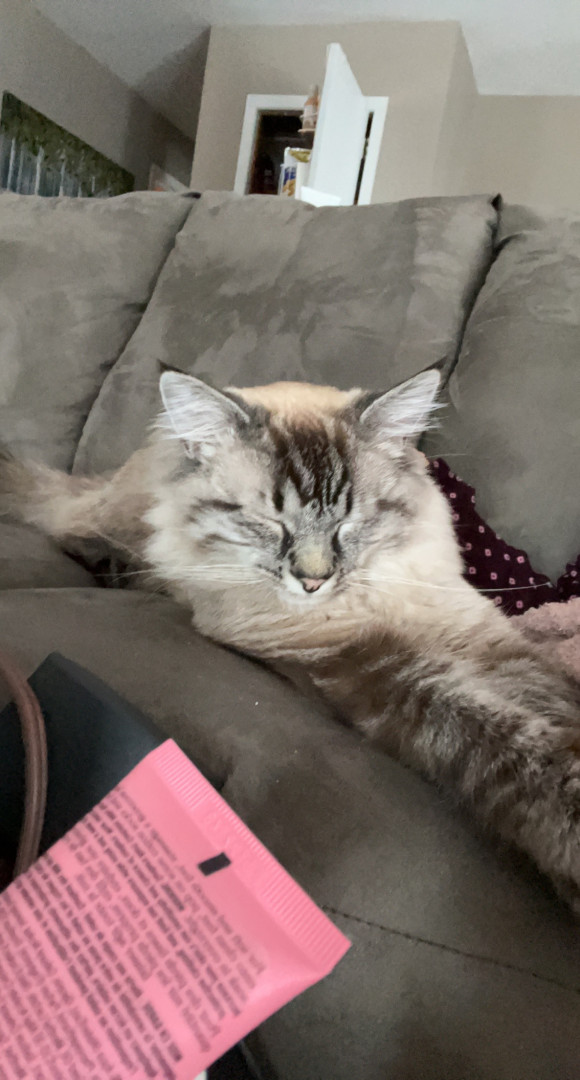 His voice. He’s very chatty about his daily life and is a snuggle dog in a cat’s body. We have a conversation every time I come home as a welcome; included with ankle rubs.