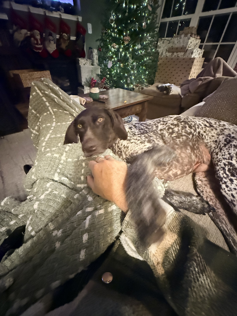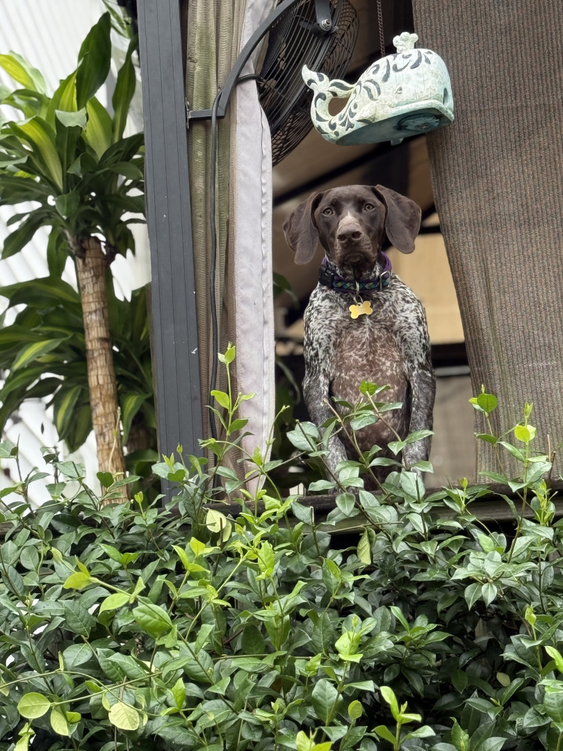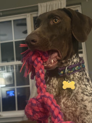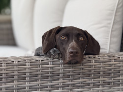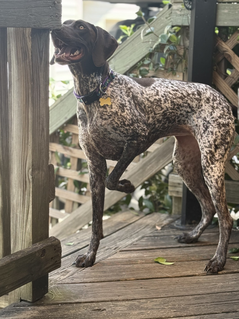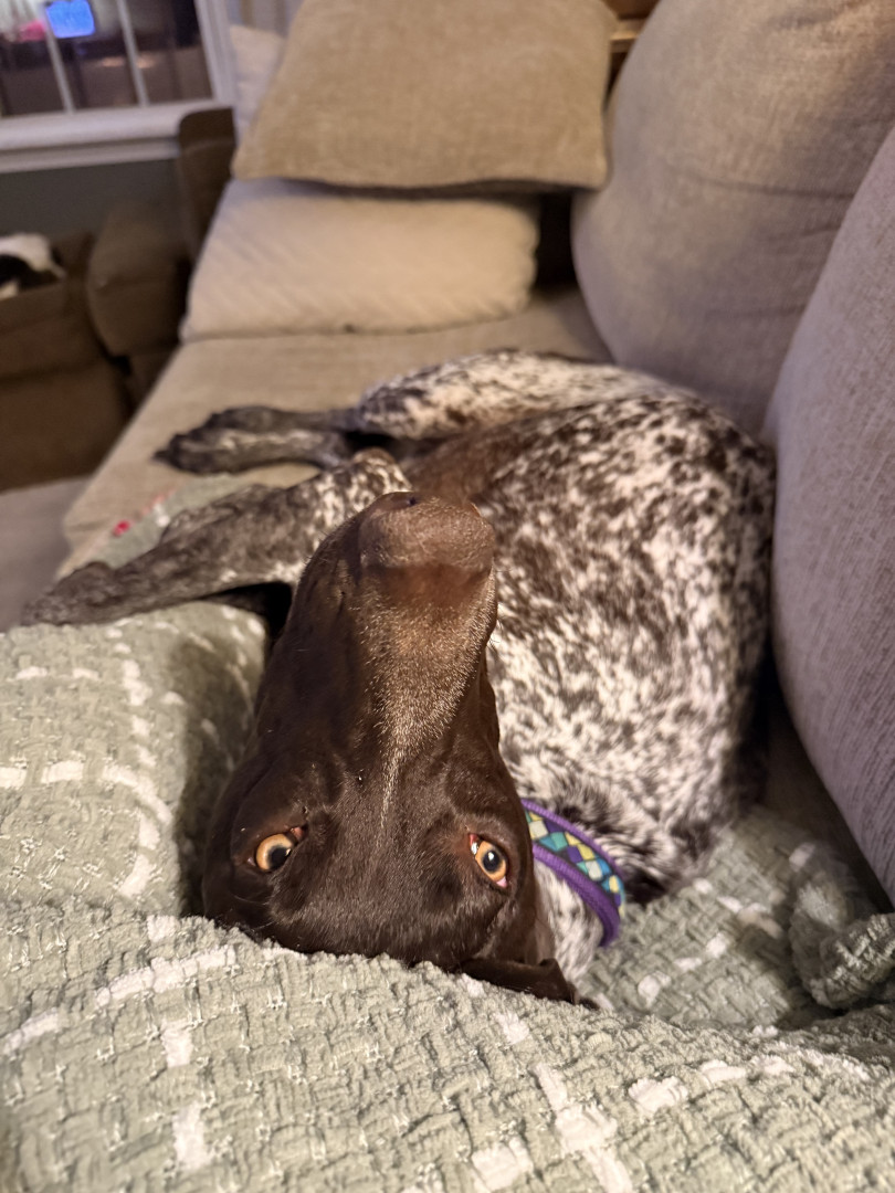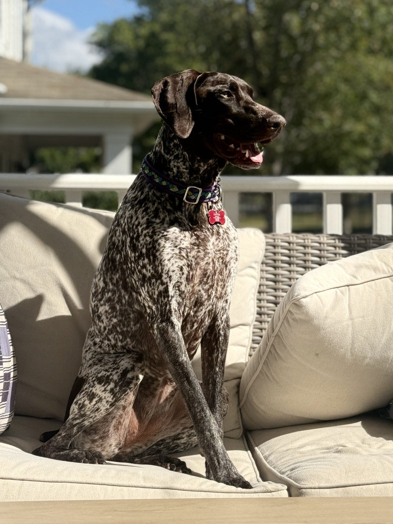 We got Leona and named her in memory of our GSP that passed named Leo. She has a way of welcoming us at the door by shaking only her back end and cuddling behind your knees on the couch. She get excited when you grab your keys and ask her if she wants to go for a ride. These all give us a sense of comfort in missing Leo through her love