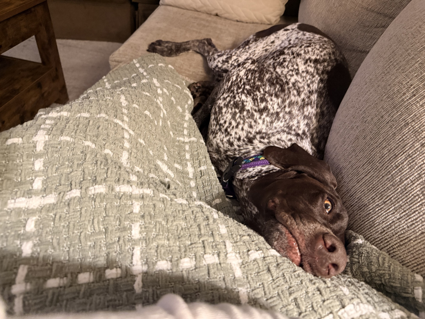 Is a bird dog by DNA but a lizard dog at heart. She is energetic, whines when she wants your attention and loves to cuddle and give hugs