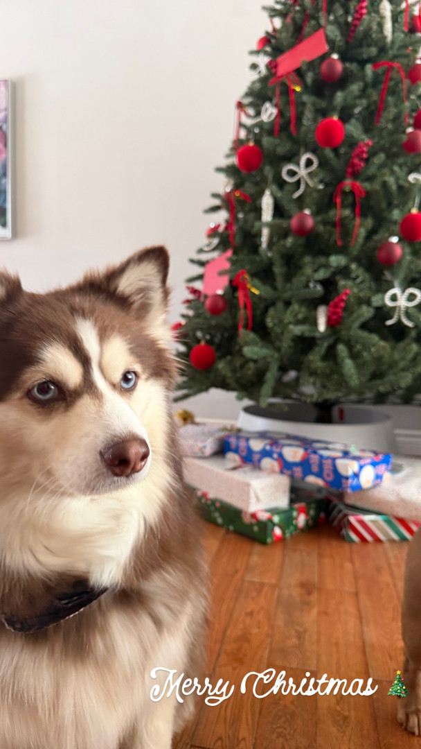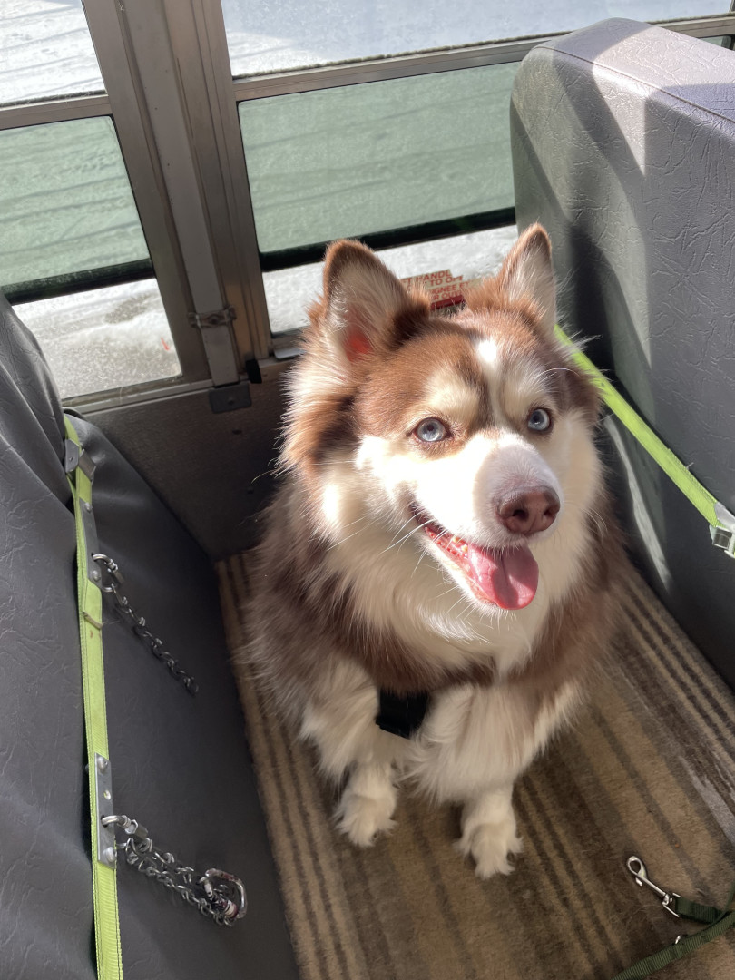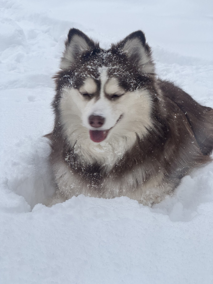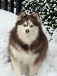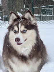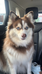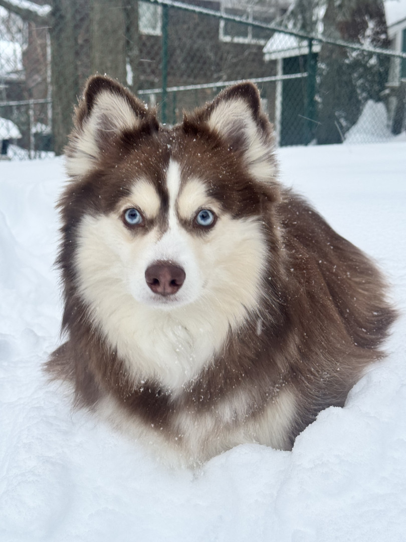 Leo, blue eyes—playful Pomski who lives for snow, joyful leaps & cuddles, proving the biggest energy can hold the kindest heart